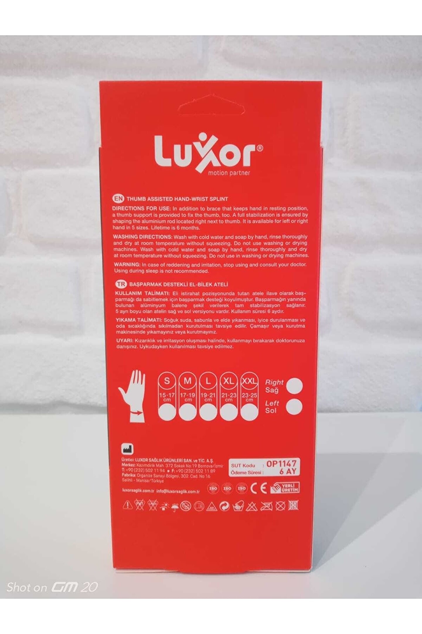 506 - THUMB ASSISTED HAND-WRIST SPLINT;In addition tohand-wrist splint that keeps hand in resting position, a thumb support providesthe thumb with fixing as well. A full stabilization is ensured by shaping thealuminium rod located right next to thumb. There are both left hand and righthand version. It has 5 sizes.;506 - BAŞPARMAK DESTEKLİ EL-BİLEK ATELİ;Eli istirahat pozisyonunda tutan atele ilaveolarak baş parmağı da sabitlemek için baş parmak desteği koyulmuştur. Başparmağın yanında bulunan alüminyum balene şekil verilerek tam stabilizasyonsağlanır. 5 ayrı boyu olan atelin sağ ve sol versiyonu vardır.;S Beden - 15-17 cm;M Beden - 17-19 cm;L Beden - 19-21 cm;XL Beden - 21-23 cm;XXL Beden - 23-25 cm
