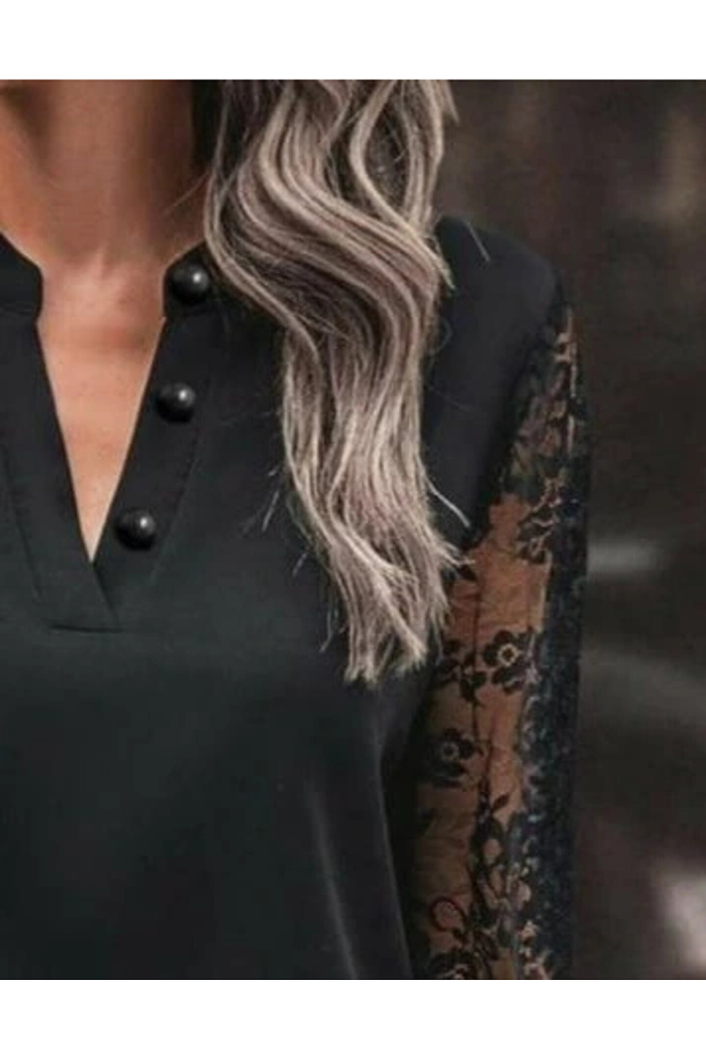 Kadın Uzun Kollu Yaka Düğme Detay Güpürlü Kol Krep Bluz
