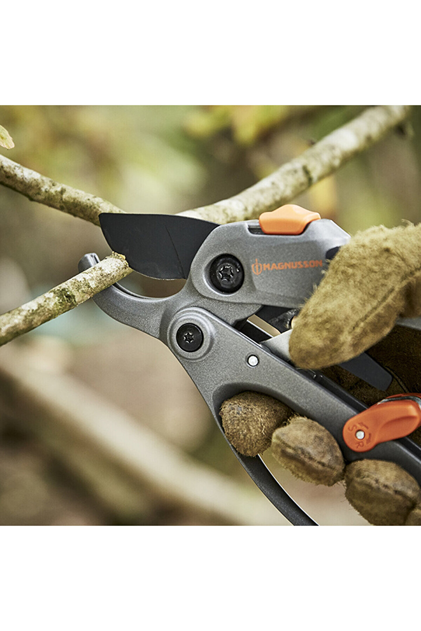 Magnusson Parmak Korumalı Kuru Dal Makası Özellikleri Magnusson Parmak Korumalı Kuru Dal Budama Makası, metal gövdeden üretilmiştir.; Plastik sapları sayesinde oldukça hafifletilmiştir.; Kullanımı ergonomik ve kolaydır.; Pratik kesimi sayesinde konforlu bir çalışma sağlar.; Güçlendirilmiş özel alaşım metalden üretilmiş olup; Ayarlanabilen örs bıçağı ve çözülmeyi engelleyen kontra vida ürün üzerindedir.; Parmak koruma yapısı ile daha rahat ve güvenli kullanım sunmaktadır.; Kesim mesafesi ve tutuş aralığı kolaylıkla ayarlanabilmektedir.; Ayrıca ağız açıklığıda kesim mesafesine ve tutuşa göre ayalanarak daha kolay ve hızlı kullnım sağlanmaktadır.; Kuru dalların budama işleminde rahatlıkça kullanılabilmetedir.; Kolay ve rahat kullanım-Keskin bıçak ile kolay ve rahat işlem için ayarlanabilir tutuş ve kesim hacmi sağlamaktadır.; Teknik Özellikler; Modeli: Dal Makası Malzeme: Metal Renk: Krom-Turuncu Fonksiyon: Parmak Korumalı Kuru Dal Ürünlerimiz Magnusson Markalı Olup; İthaldir.; 24 Ay Garantili.