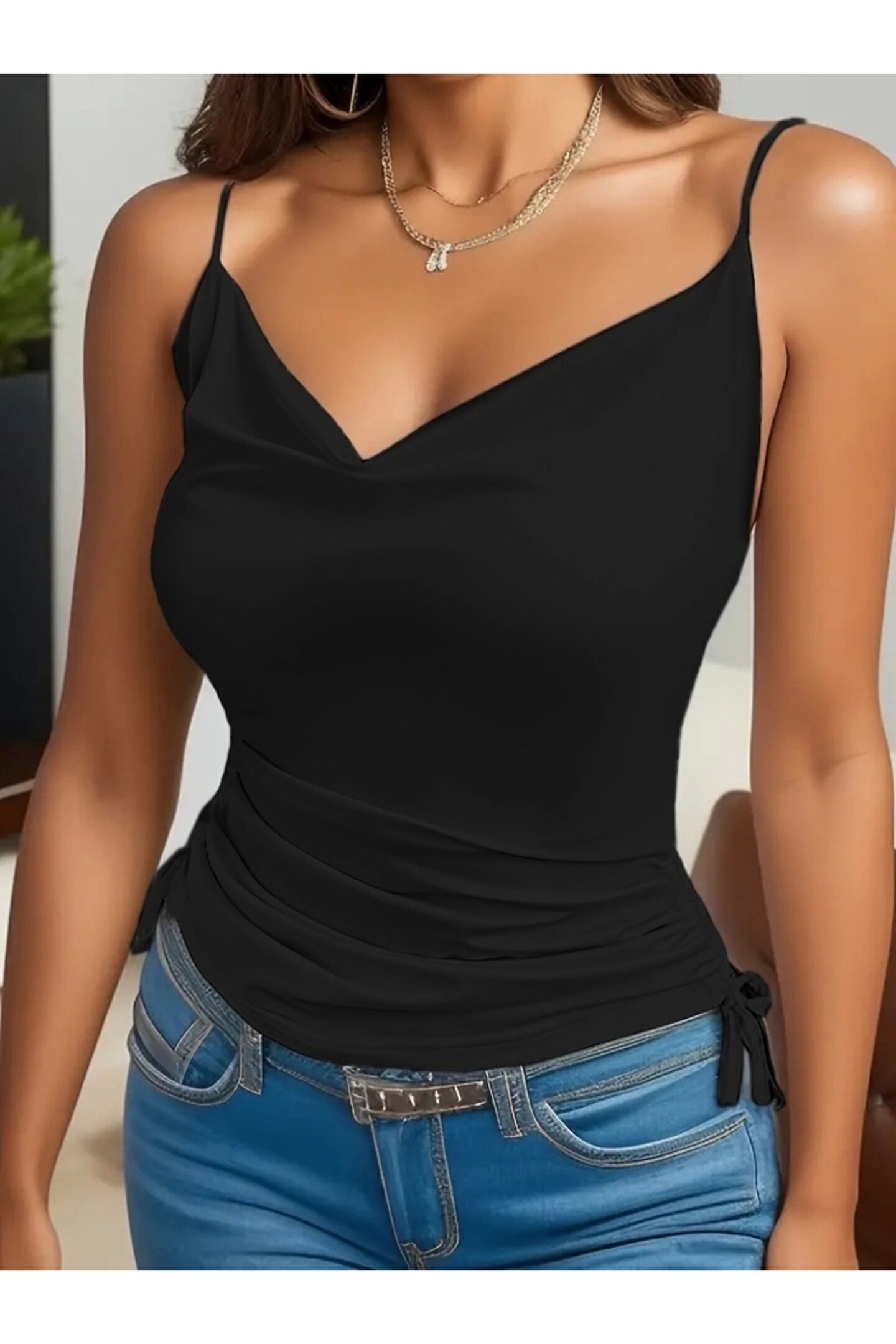 mall of gkc Kadın Askılı Degaje Yaka Yanlardan Büzgülü Sandy Bluz