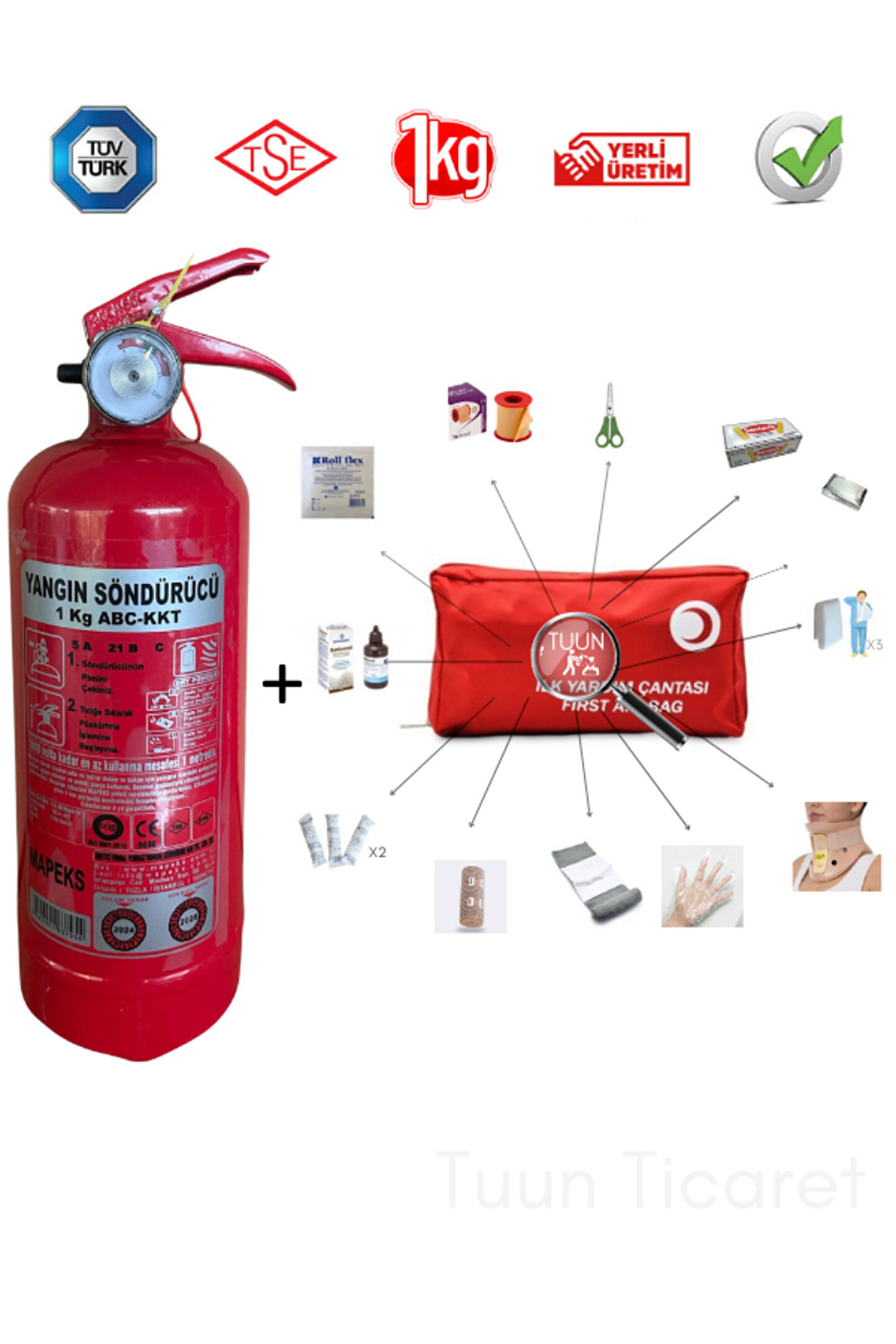2025 ocak tarihi son kullanım tarihi 2027 ocak 1 Adet 1 Kg Mapeks KKT yangın tüpü, 1 Adet Boyunluk, İlkyardım çantası içeriği: 1 adet acil durum örtüsü, 5 adet 7,5x7,5 kompres, 1 Adet Elastik Bandaj 1 Adet Tıbbı Turnike 2 Adet 10x150 cm Hidrofil Sargı Bezi 1 Adet Makas 5 Adet Yara bandı 1 Adet İlkyardım Yapıştırma Bandı, 1 Çift Şeffaf Eldiven, 2 Adet Antiseptik Solüsyon; Batiqonix 10 Adet Mini Çengelli İğne 2 Adet Üçgen Sarı;