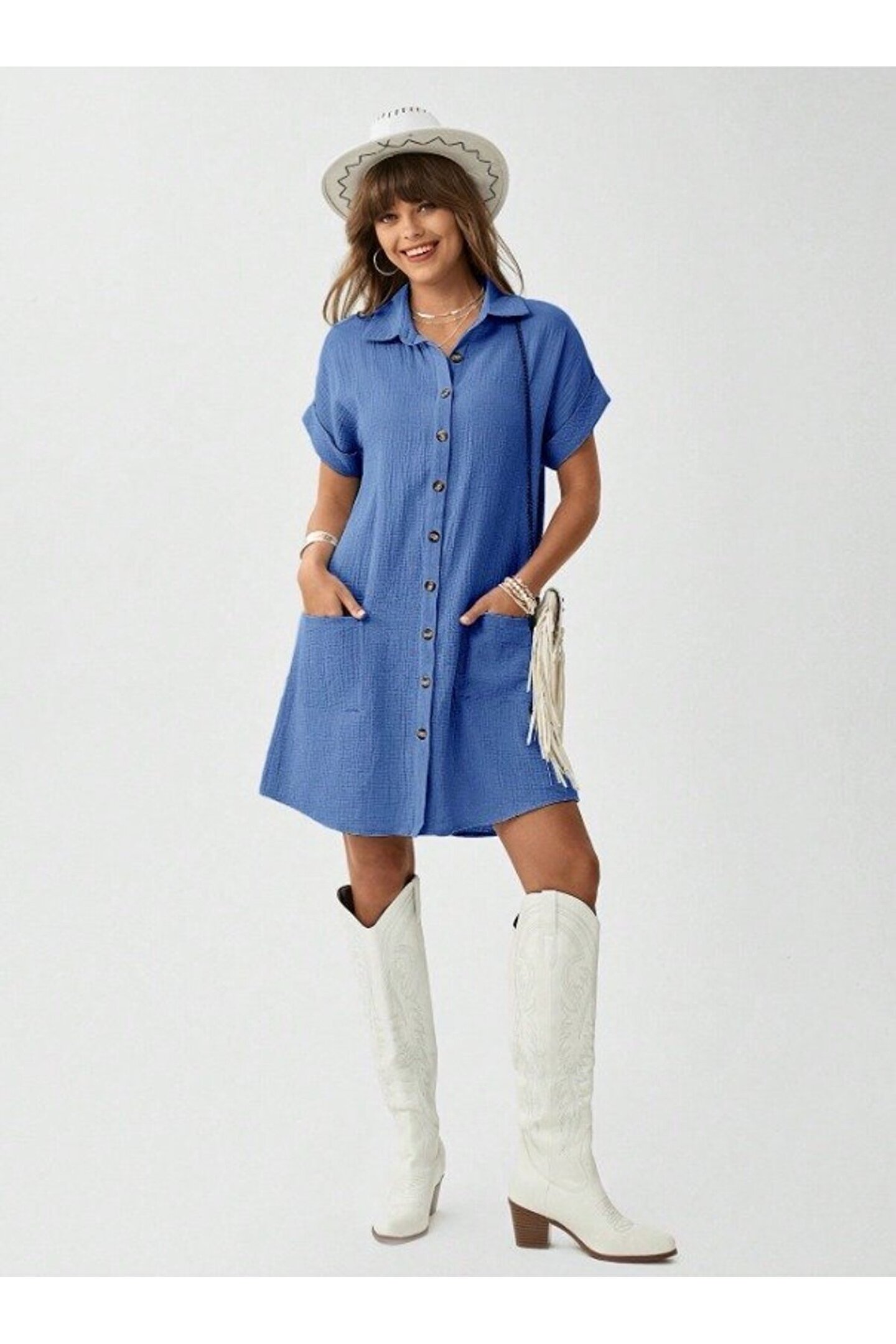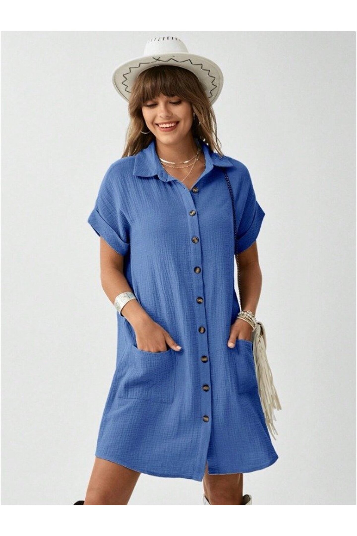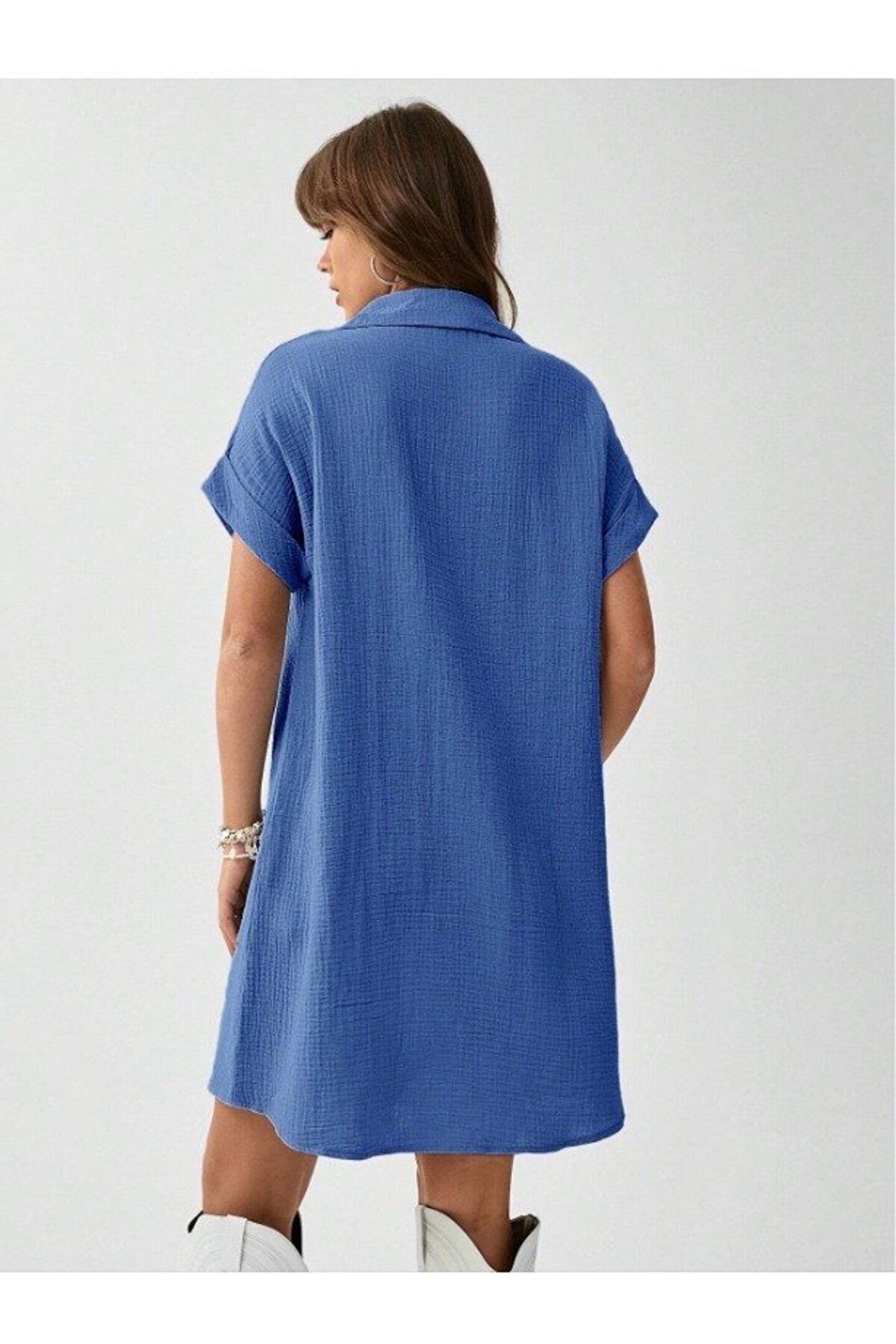 Kadın Cep Detay Müslin Kumaş Mini Gömlek Elbise