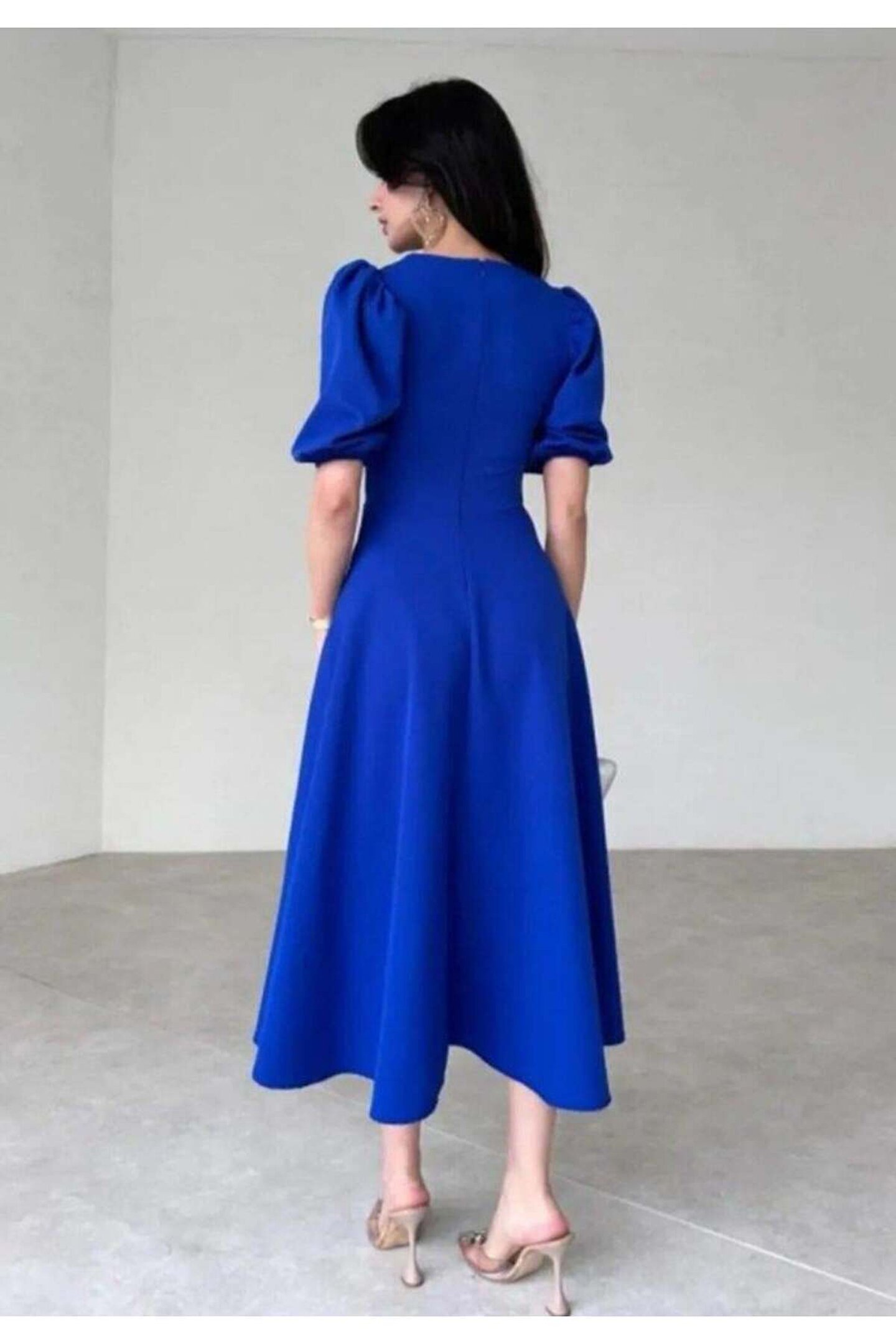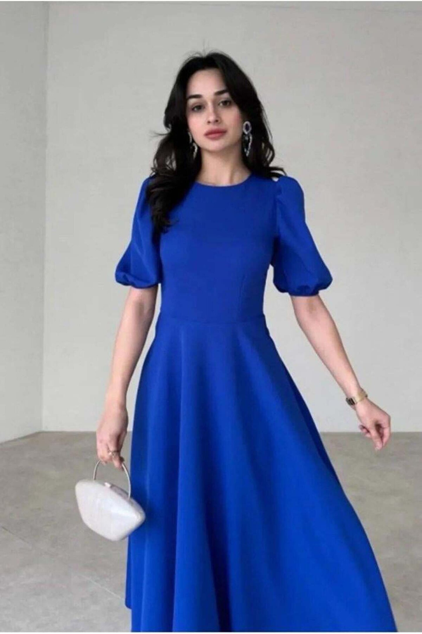 Kadın Kısa Balon Kollu Bisiklet Yaka Geniş Kesim Janjan Krep Elbise