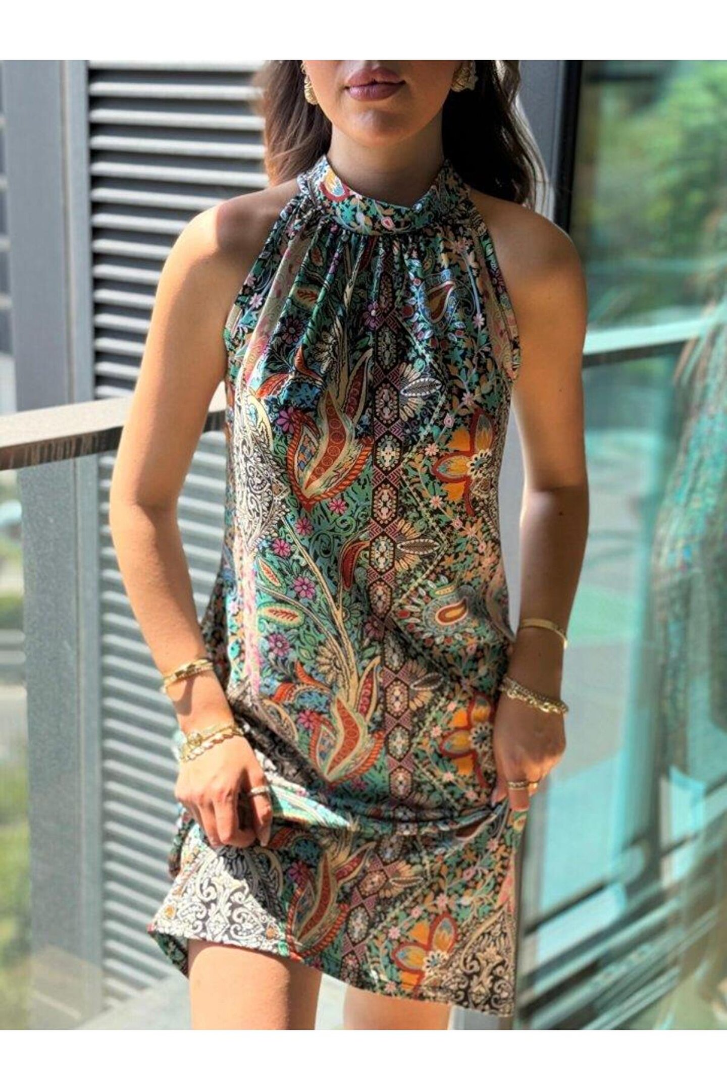Kadın Kolsuz Boyundan Askılı Desenli Midi Süprem Elbise