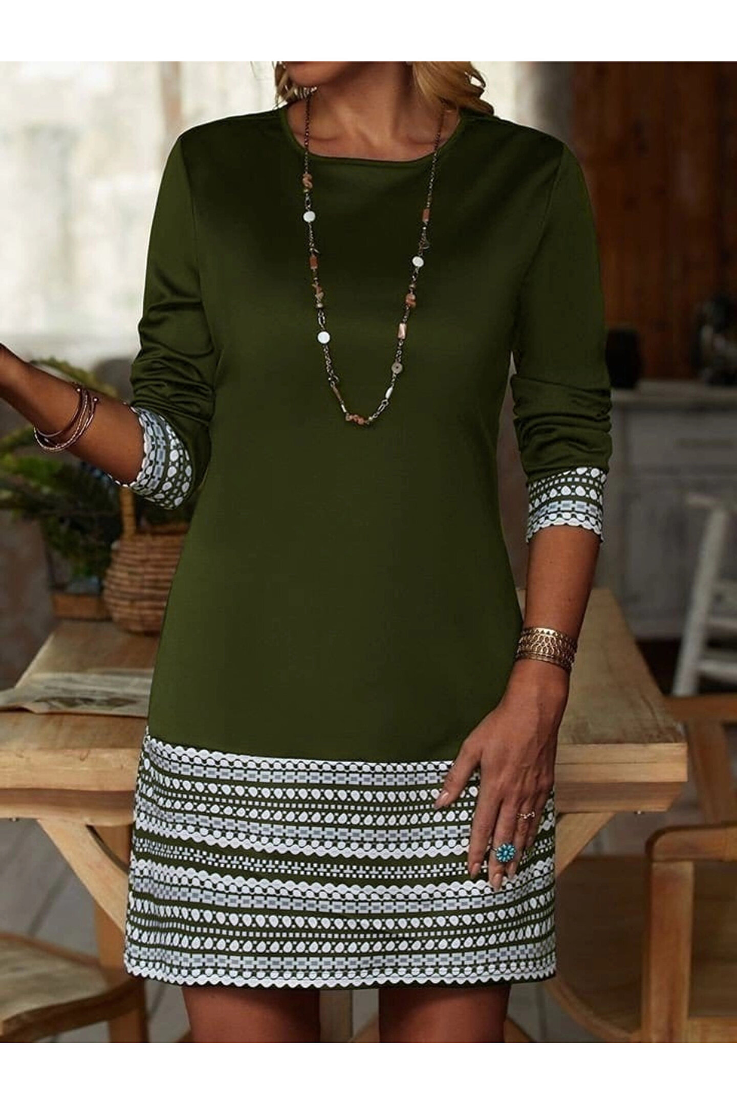 Kadın Uzun Kollu Bisiklet Yaka Kol Ağzı Ve Etek Ucu Baskılı Iki Iplik Elbise