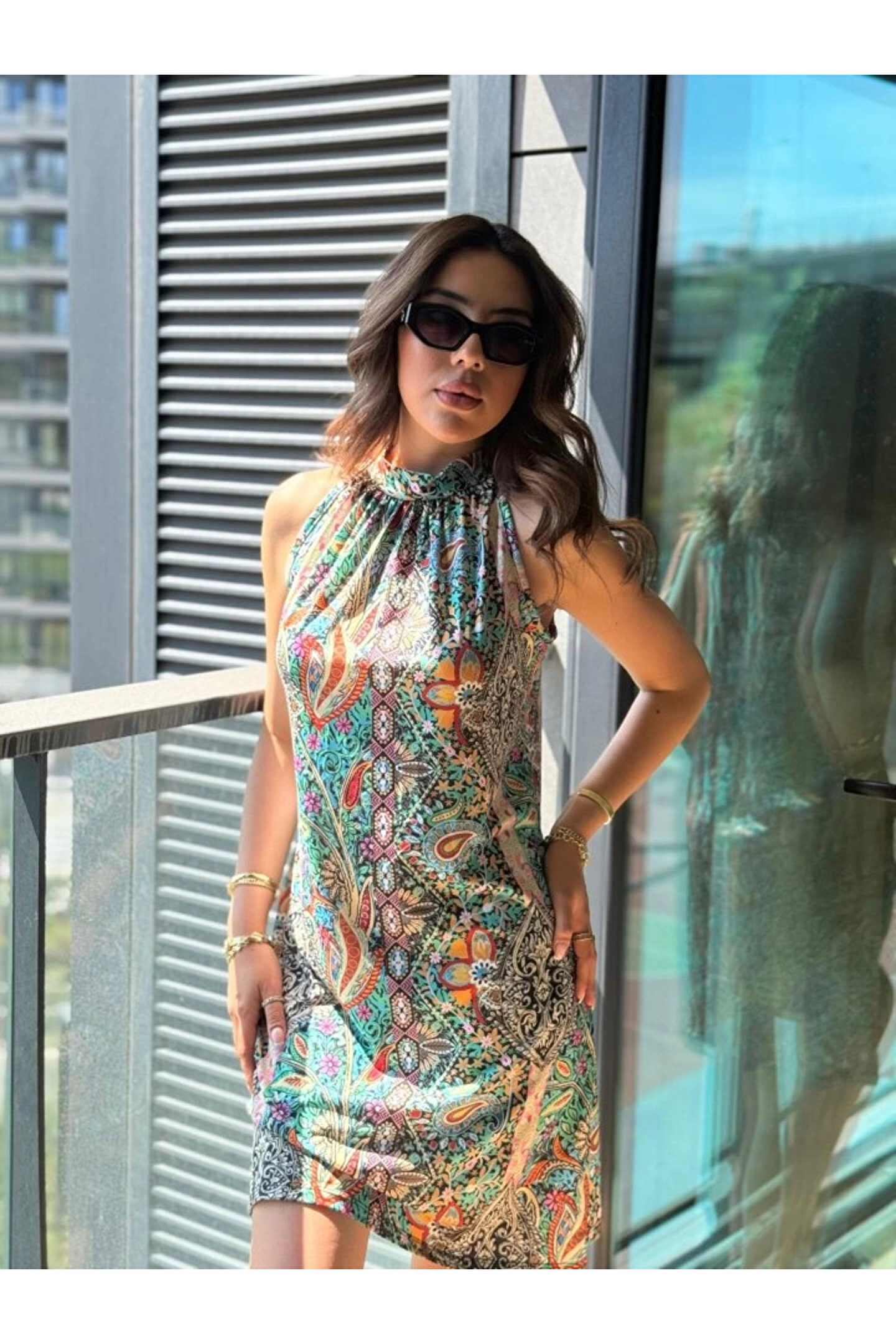 MDB Kadın Kolsuz Boyundan Askılı Desenli Midi Süprem Elbise