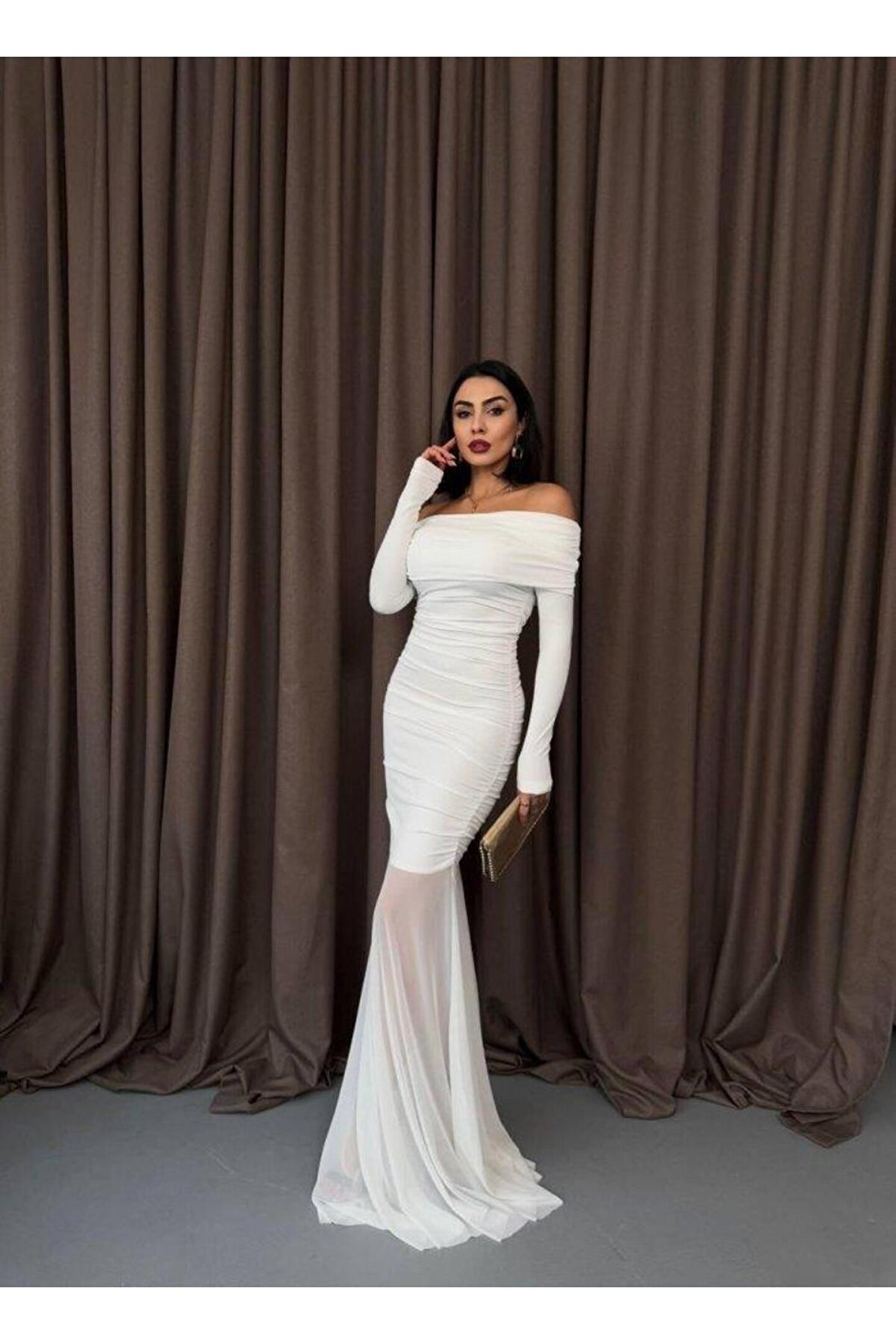 Kadın Uzun Kollu V Yakalı şeritli Tül Detaylı Ithal Krep Elbise