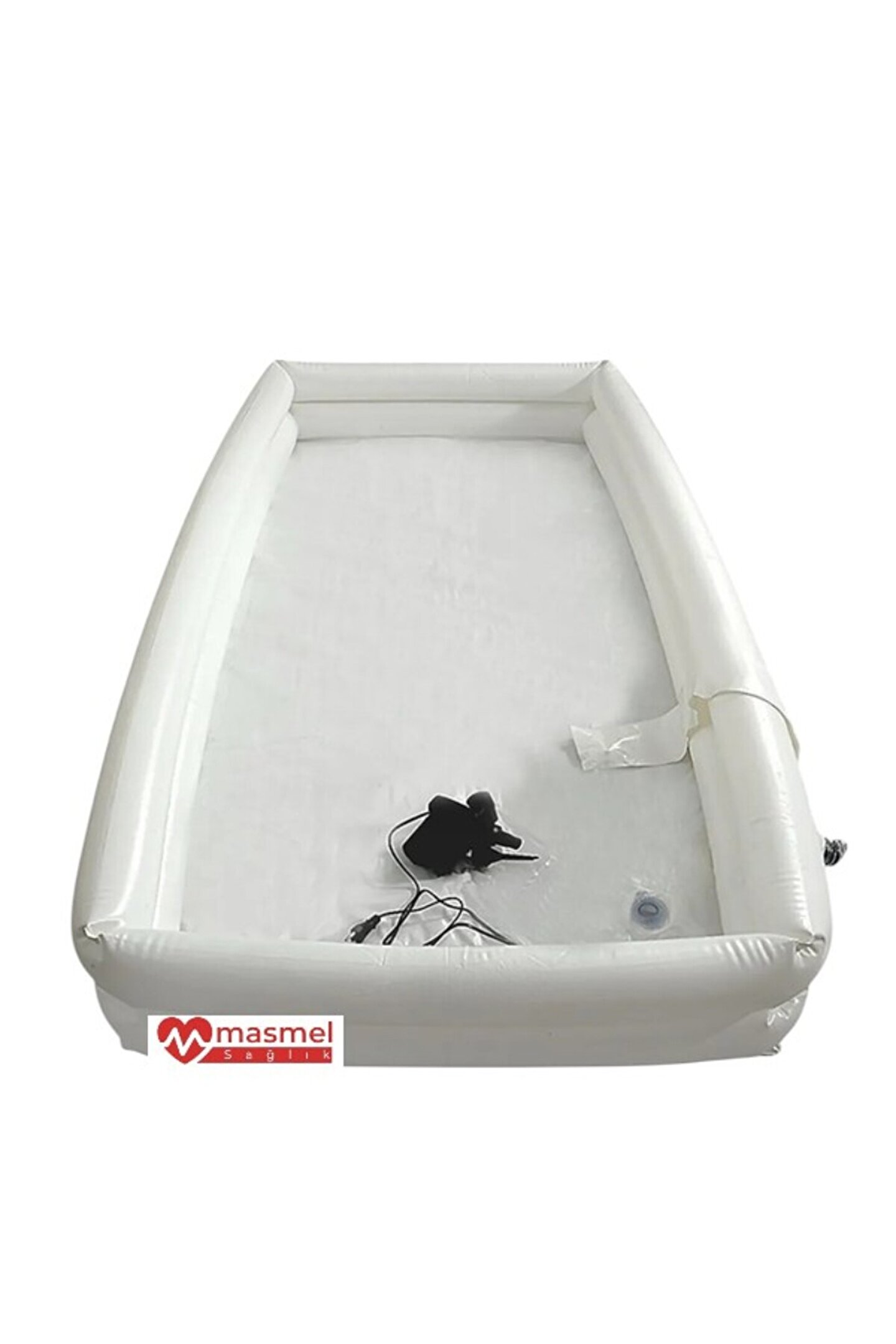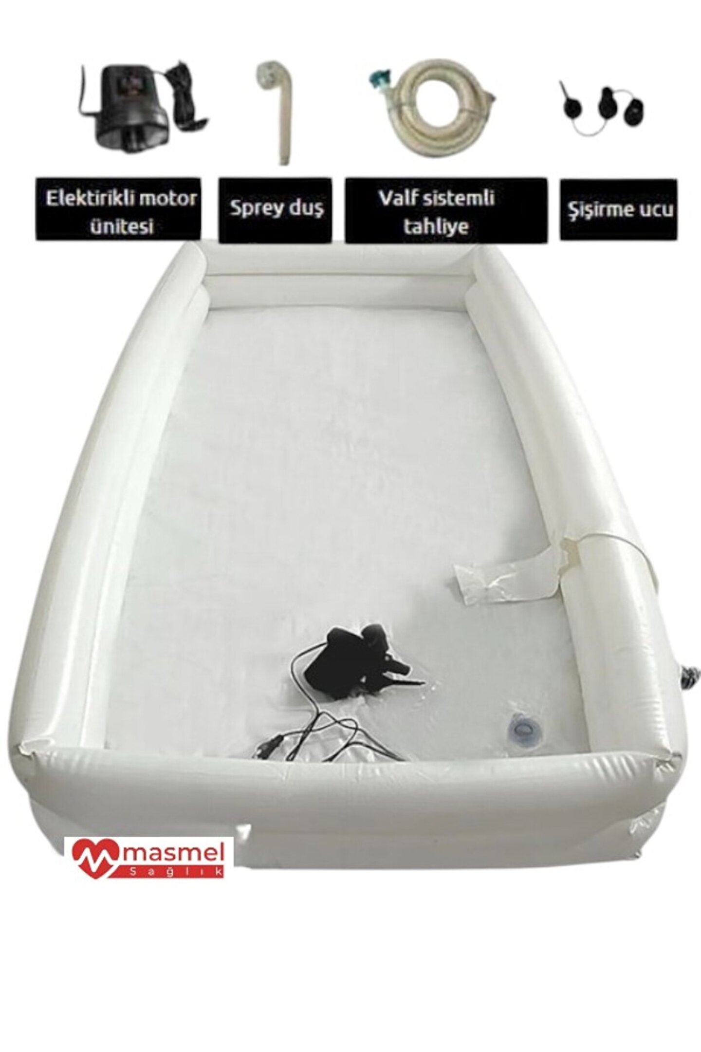 Küvete dönüşebilen hasta yıkama havuzumuzda bulunan setler; Elektrikli motor ünitesi, sprey duş, valf sistemli tahliye ve şişirme ucu.