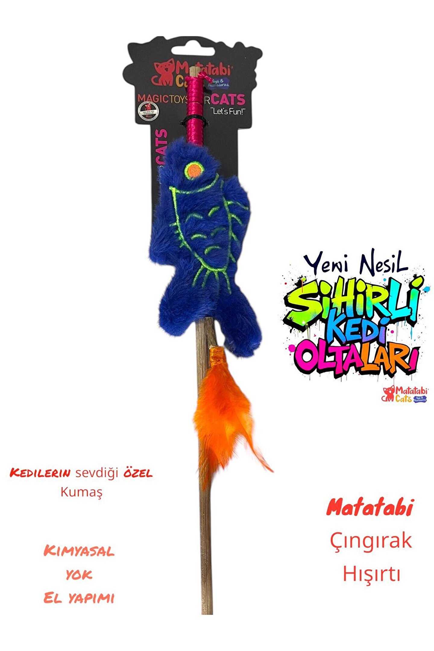 Kedinizle birlikte keyifle vakit geçirebileceğiniz,birincisınıf malzemelerden yapılmış interaktif kedi oyuncağıdır.Olta ucundaki oyuncakve içerikleri sayesinde kedinizin kendi kendine bileoynayabileceği,sahiplenebileçeği bir oyuncaktır.Uç ksımlarında kullanılantüyler doğal avlanma güdülerine uygun horoz tüyleridir(BİTKİSEL BOYALARLARENKLENDİRİLMİŞTİR) ve uzun süre dayanır.HİÇBİR KİMYASAL MADDE VEYA YAPIŞTIRICIKULLANILMAMIŞTIR.Parçalar birbirlerine tamamen dikişlerle tutturulmuştur