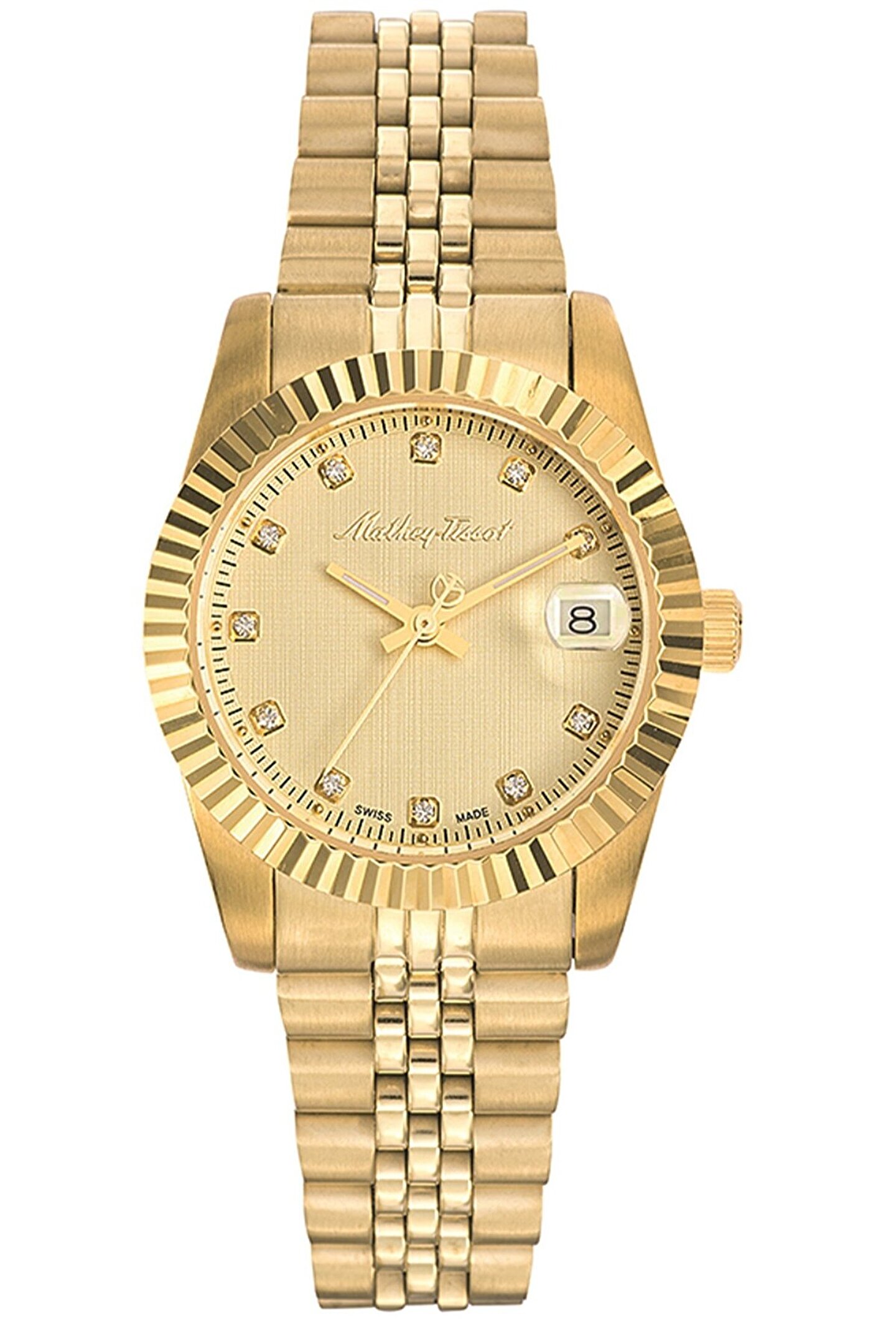 Marka Mathey Tissot Cinsiyet: Bayan Kasa Cinsi: Çelik Kasa Rengi: Metal Kordon Cinsi: Çelik Kordon Rengi: Sarı Kadran: Beyaz Takvim Var Cam: Mineral Kasa Ebatı: 32mm Menşii: Swıss Madde