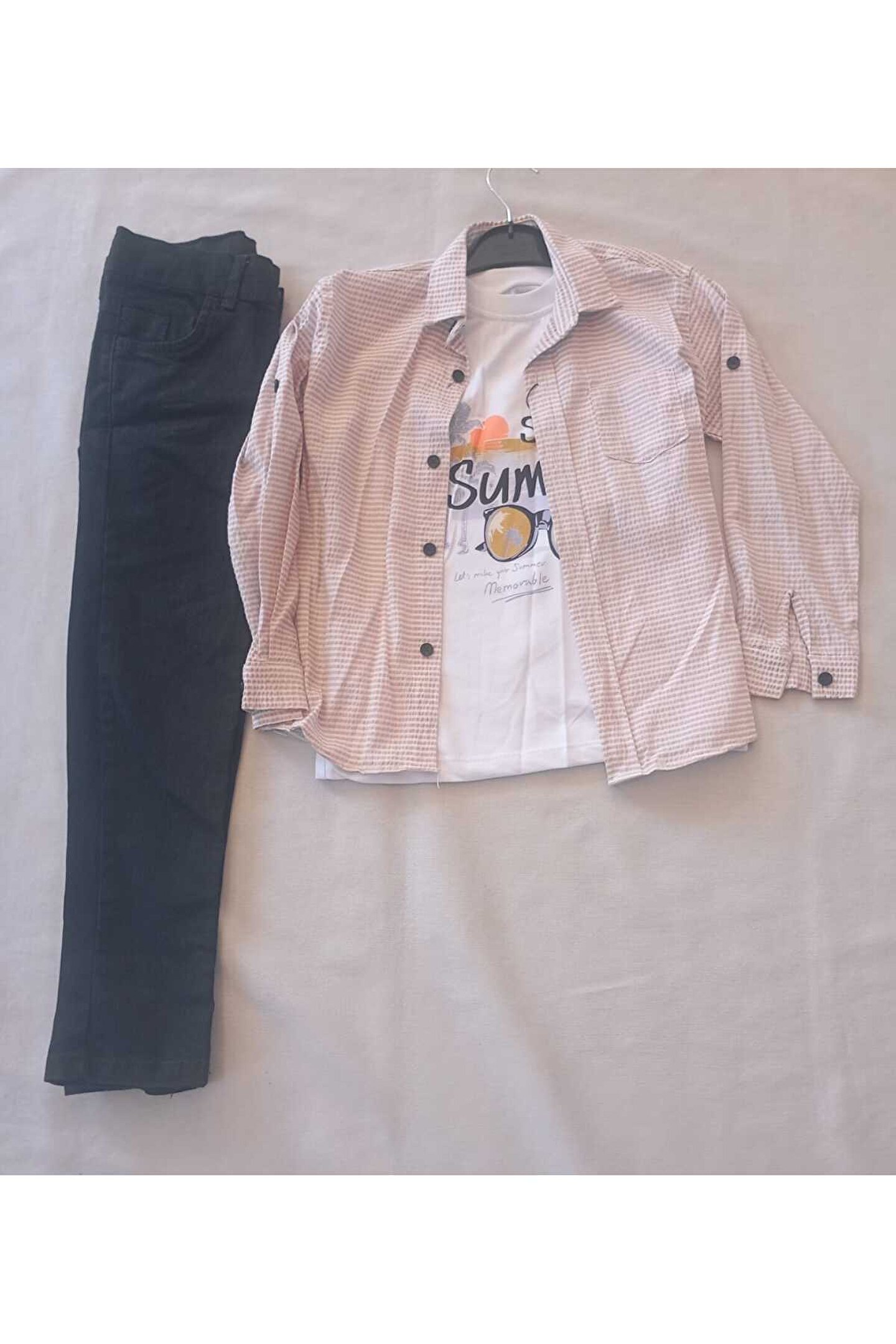 Rahat ve geniş kesimi ile her yaş grubuna hitap eden oversize kalıp, gün boyu konfor sunar; Çocukların hareket özgürlüğünü kısıtlamayan regular boy tasarım, rahat bir kullanım sağlar; Göz alıcı beyaz baskılı badili üst ve beyaz açık mor çizgili siyah kotlu alt parça ile şık bir kombin oluşturur; Denim kumaşın dayanıklılığı ve nefes alabilir yapısı, uzun süreli kullanım için idealdir; Askılı kol tasarımı yaz aylarında serinlik ve rahatlık sunarken, baskılı deseniyle dikkat çekici bir stil vurgusu yapar;