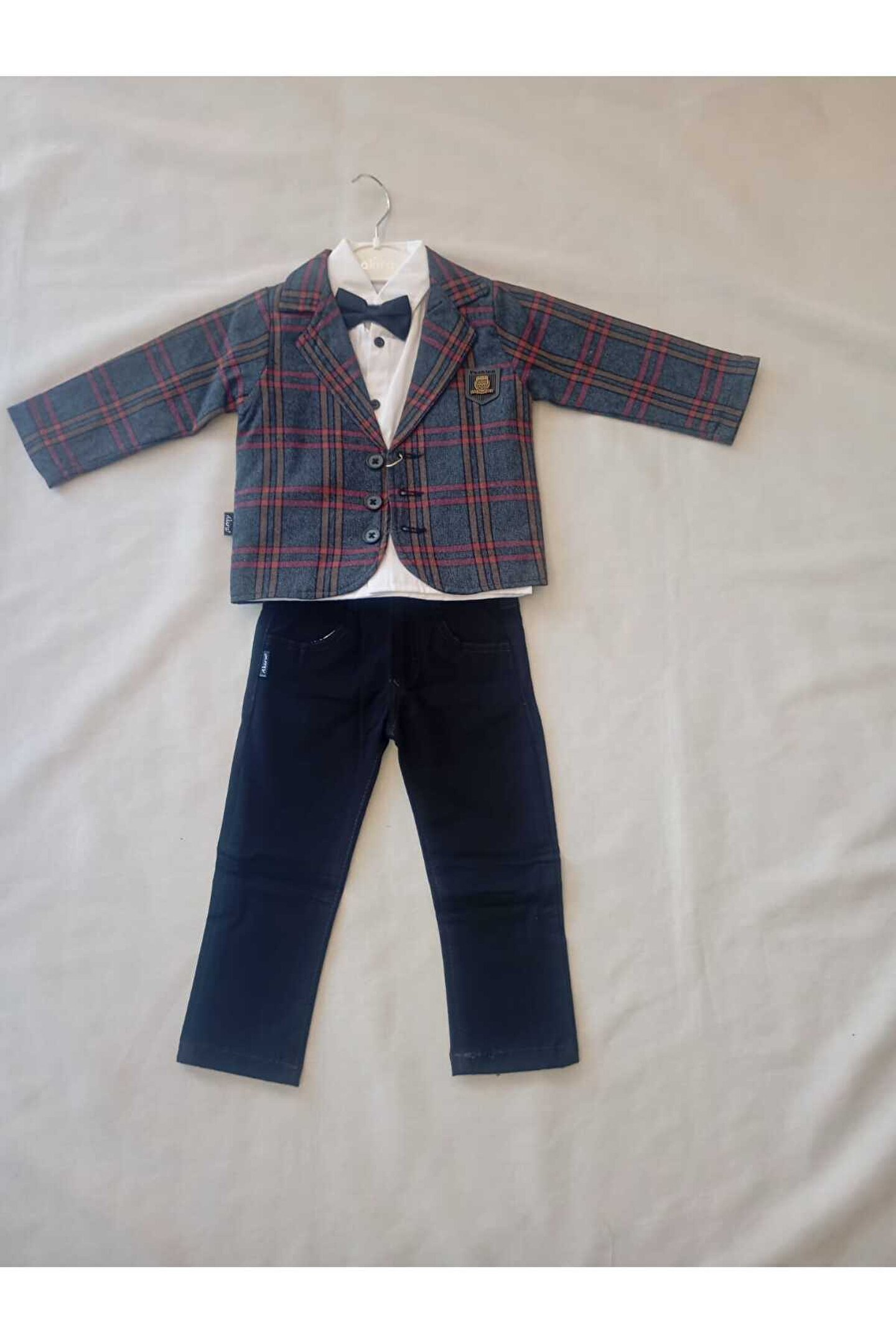 Her yaştan çocuğa uygun tasarımıyla dikkat çeken beyaz gömlekli papyonlu takım elbise, rahatlık ve şıklığı bir arada sunuyor.; Regular boy kesimi ile konforlu bir kullanım sağlarken, oversize kalıbı sayesinde hareket özgürlüğünüzden ödün vermeden tarzınızı yansıtmanızı sağlar.; Denim kumaşı dayanıklı yapısıyla uzun süreli kullanım vaat ederken, ekose / kareli deseniyle klasik ve zamansız bir görünüm kazandırır.; Oversize siluetiyle modern çizgiler taşıyan bu takım elbise, çocuğunuzun gardırobunda fark yaratacak bir parça olmaya adaydır.;
