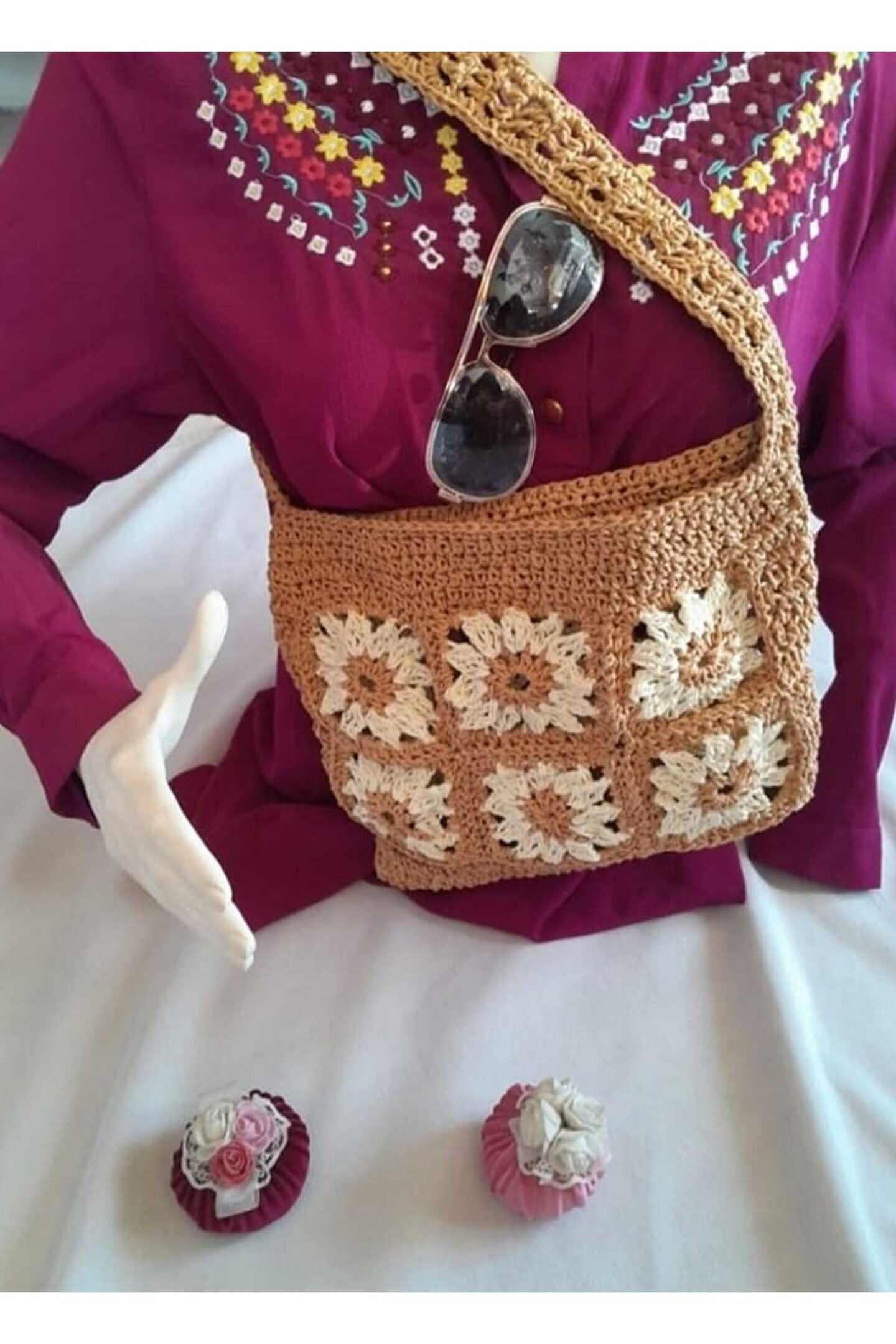 Günlük kullanıma uygun tasarımıyla her ortamda rahatlıkla tercih edilebilen kahve çiçek desenli el örgüsü kol çantası, şıklığınızı tamamlar; Göz alıcı desenleriyle dikkat çeken bu çanta, stilinizi yansıtan bir aksesuar olarak öne çıkar; Her yaş grubuna hitap eden geniş kullanıcı yelpazesi ile herkesin beğenisine sunulan bu omuz çantası, zamansız bir tarz sunar;
