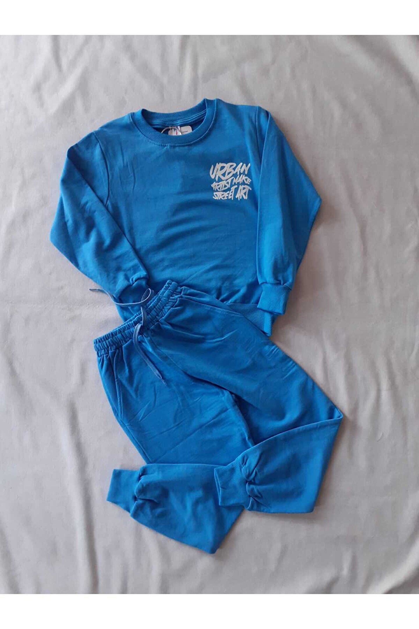 Mavi baskılı sweatshirt ve paçaları lastikli eşofan takım, her yaştan insanın rahatça kullanabileceği oversize kesimiyle öne çıkar; Dokuma kumaş yapısı sayesinde uzun süreli kullanım için idealdir ve regular boyu ile konforlu bir oturuşa sahiptir; Askılı kol tasarımı ise yaz ayları için serinlik ve hava alabilirlik sağlar; Çocukların da keyifle kullanabileceği bu takım, düz renk seçeneğiyle sade ve şık bir görünüm sunar; ;;