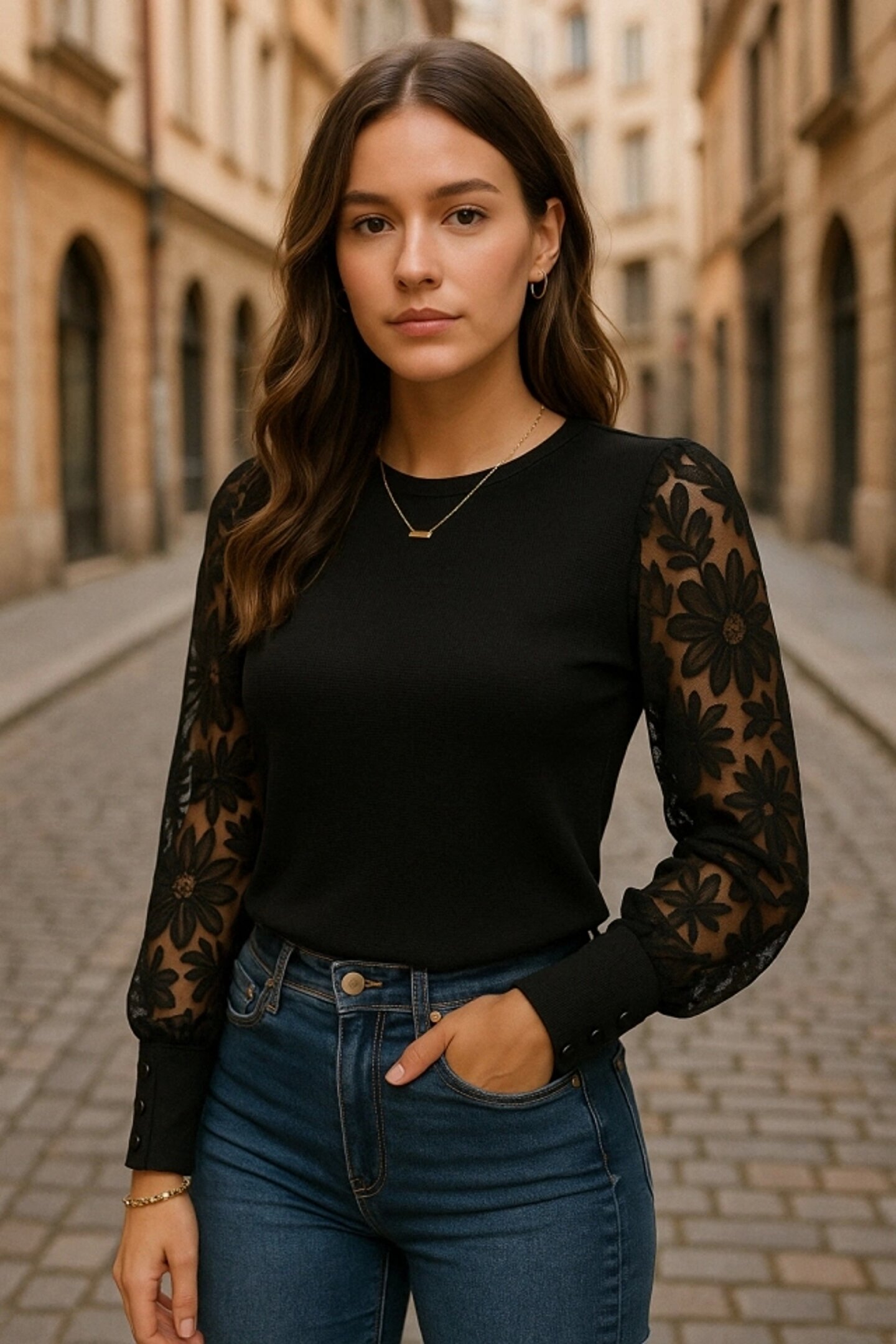 Kadın Uzun Kollu Bisiklet Yaka Kolları çiçekli Waffle Bluz