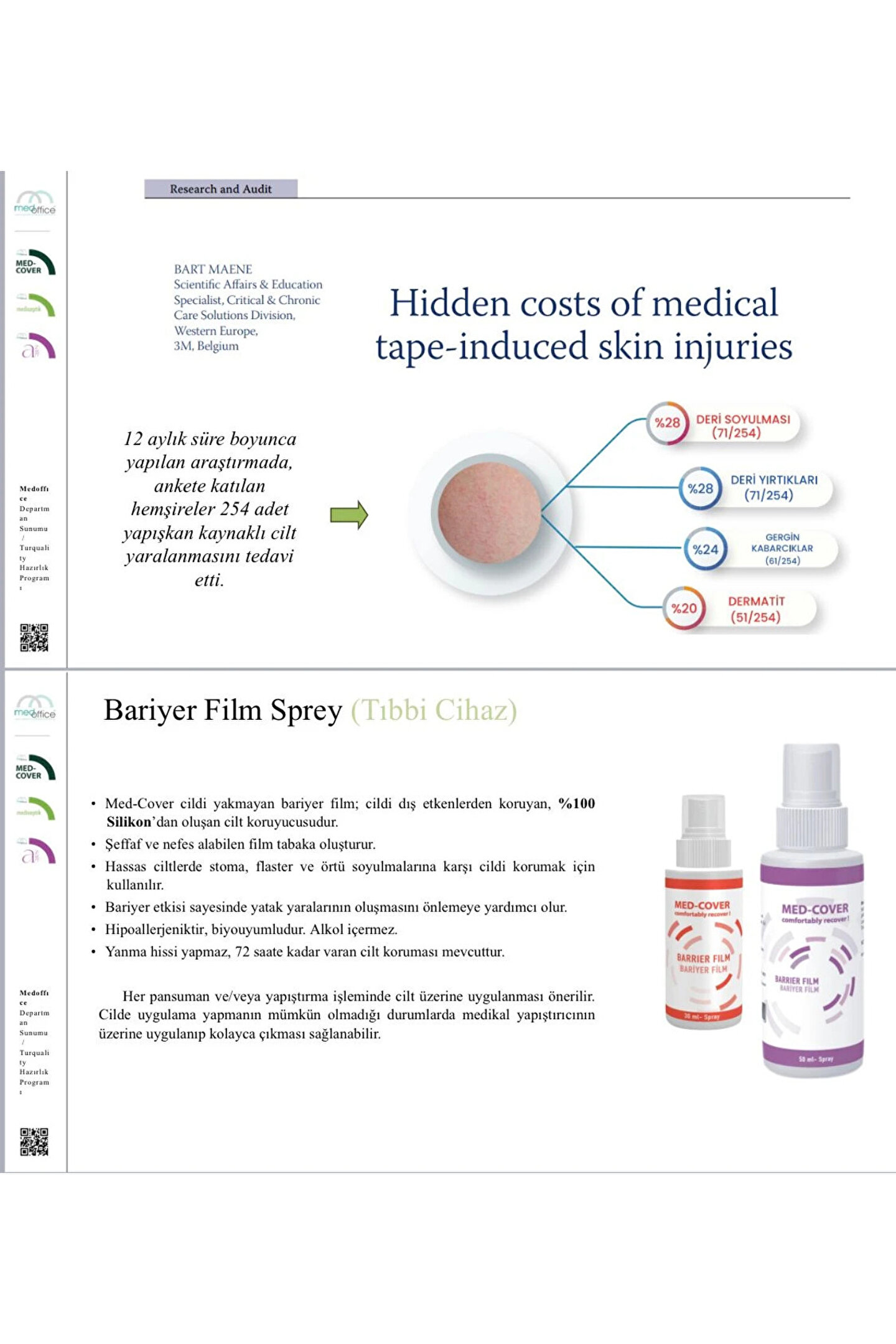Med-Cover Bariyer Film Spreyi %100 Silikon esaslıdır. ; Şeffaf bir bariyer tabakası oluşturur. ; Uzun ömürlüdür ve tam koruma sağlar. ; Maksimum 30-45 saniyede kurur. ; Şeffaf, nefes alabilen, kalıcı ve dayanıklı bir bariyer tabakası oluşturur. ; Ürün uygulandıktan sonra kullanılacak olan alçı,ostomi adaptörü yara bakım ürünlerinin yapışmasını engellemez. ; Tahriş edici değildir;