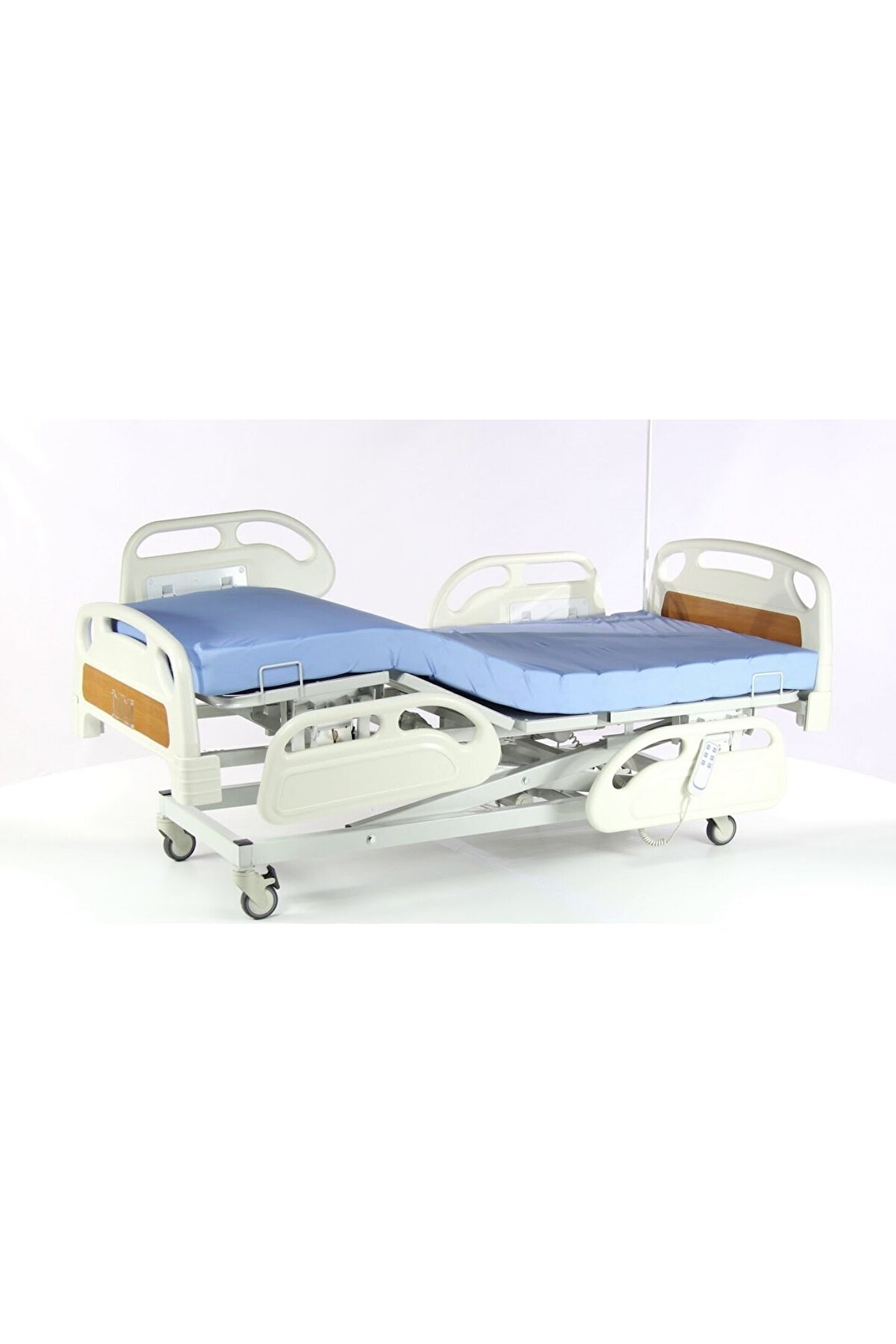 3 Motorlu Hasta Karyolası Anti Dekübit Yatak Uzun süre yatan hastalarda oluşan yatma (dekübit) yaralarını engelleyen özel olarak tasarlanmış lazer hava kanallı sıvı geçirmez yatak.; ; Pozisyon ve Hareketler Elektronik başucu, ayakucu, yükseklik ayarları.; ; Trendelenburg ve Ters Trendelenburg.; ; Fowler, Vasküler, Kardiyak,Auto-contour ve Sırt ve ayakucu kaydırma sistemi.; ; Teknik Özellikler Yerden yatma yeri yüksekliği 49 - 78 cm arası ( yataklı 62 - 91 cm arası ) Korkuluk yüksekliği 34 cm ( yataklı 21 cm) Başlık ve ayakucu yüksekliği 49 cm (yataklı 36 cm) Karyola ebatları 210*110*98 cm Yatak ölçüleri 190*90*13 cm Diğer Özellikler Kitlenebilir, gizlenebilen PP yan korkuluklar, çıkarılabilir PP başucu ve ayakucu paneller, boyama öncesi otomatik makinelerde yıkama ve temizlik, elektrostatik toz boyalı metal gövde, kademeli olarak ayarlanabilir ayakucu, iki yanda idrar torba kancası, dört köşede serum askısı yuvaları, serum askısı, koruyucu köşe tamponları, kilitlenebilir tekerlekler.; ; Opsiyonel Özellikler Elektronik tartı sistemi, sırt kısmında manuel CPR, akü, yatak boyu uzatma, oksijen tüp taşıyıcı, sırt kısmında X-ray kaset yuvası, tutunma kolu, nevresim rafı, monitör sehpası, dosya taşıyıcı.;