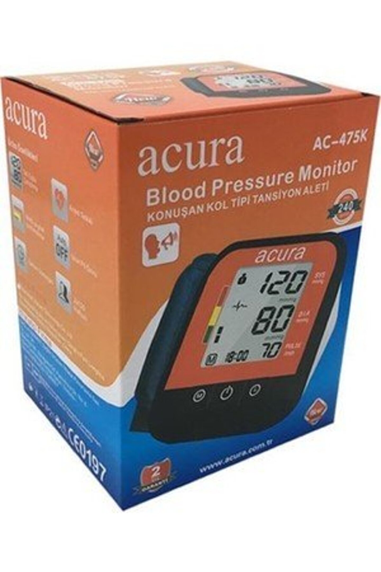 Acura AC; 475K Türkçe Konuşan Koldan Tansiyon Aleti 199 Hafıza Tarih, saat Geniş, uzun manşet Tek tuşla çalıştırma Aritmetik Tetkiki Who ya göre sınıflandırma Uzun pil ömrü Osilometrik ölçüm Doğruluk: Basınç +/; 3mmHg, Nabız: +/; 5%Max Ölçüm aralığı Basınç:0; 300mmHg, Nabız 40; 199 atım/dk Kola tam oturan konforlu hassas manşet Tam otomatik üst kol tansiiyon monitörü Daha rahat ölçüm için yumuşak şişirme Geniş Lcd ekran Manşet ölçüleri: 23; 33cm / 9; 13inç Pil ömrü 300 ölçüm (Günde iki kez kullanım) 1 dk kullanılmadığında otomatik kapanma Cihazın ağırlığı pil ile yaklaşık 265 gr; İçeriği 1 adet Türkçe Konuşan Tansiiyon Aleti 4 Adet AA Kalem Pil Kullanım Kılavuzu 2 Yıl Garanti;