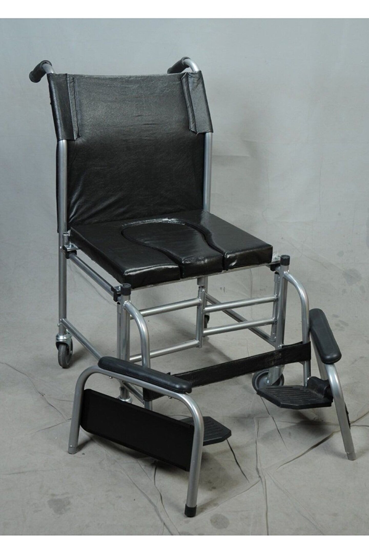 ENGELLİ SANDALYESİ Banyo ve tuvalet arabası küçük teker yerli. Oturma, sırt ve kolçak sünger üzeri vinleks kaplıdır. • Gövde katlanabilir. • Ayak koyma yeri katlanabilir. • Oturma yeri altında lazımlık bulunur. • Lazımlık yeri kapaklıdır. • 360 derece dönebilen dört adet tekerlek bulunmaktadır. • Arka tekerlekler fren tertibatlıdır. • Tüm metal aksamı STATİK BOYA kaplanmıştır.
