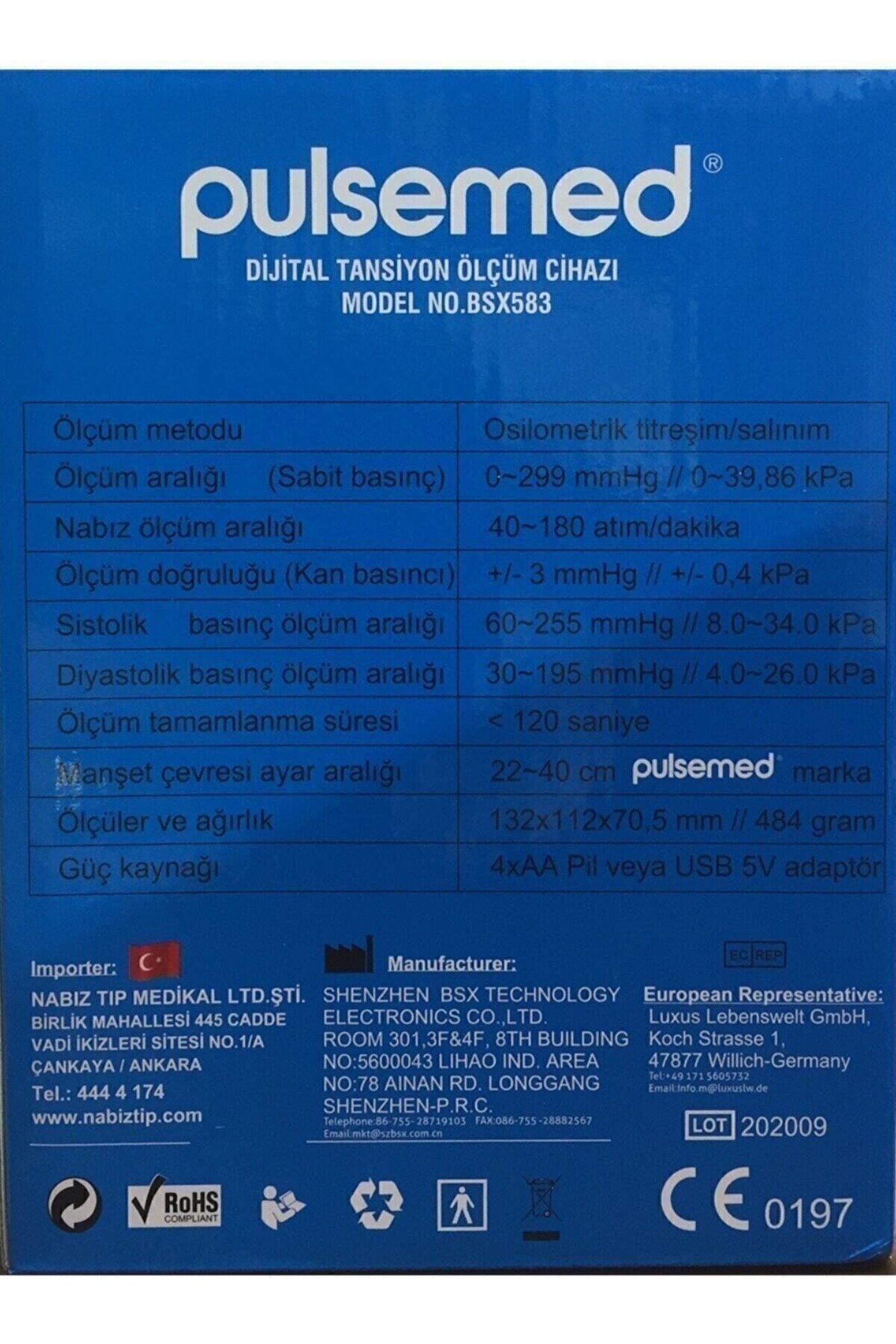 Pulsemed Konuşan Dijital Tansiyon Ölçüm Cihazı BSX583 Türkçe Konuşan Koldan Ölçer Tansiyon Aleti; Yüksek Ölçüm Doğruluğu; Akıllı Basınç Özelliği; Ritim Bozukluğu Tespiti; Dünya Sağlık Örgütü ( Who ) Göstergesi Sesli Ve Renkli; Üç Renkli Görsel Alarm ( Tansiyon Durumuna Göre Ekran Rengi Yeşil-Turuncu-Kırmızı İkaz Verir ); İki Kişilik 99 Adet Hafıza Alanı 2*99 = 198 Adet Toplam Hafıza; Usp Kablosu Dahil ( Pil Ya Da Elektrik İle Kullanım ); 22-40Cm Ebatında Büyük Kol Manşeti; Düşük Pil Göstergesi; Büyük Tansiyon,Küçük Tansiyon, Nabız Değerleri Saat Ve Tarih İle Birlikte Gösterim; Alarm Özelliği; Saklama Çantası,Pil Ve Ups Kablosu İle Teslimat;