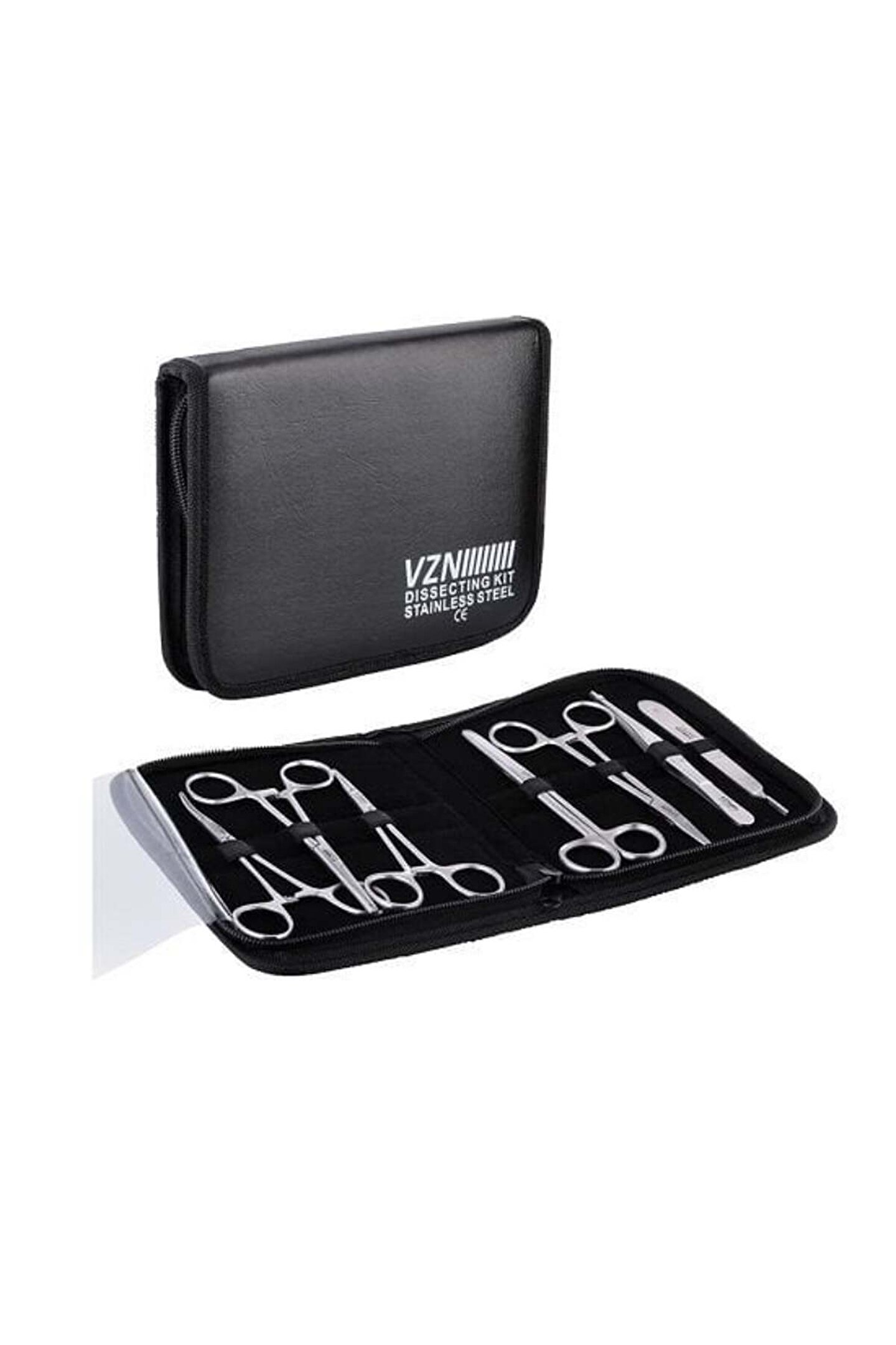 Dikiş-Pansuman Seti 7 Parça Dikiş Atma Eğitim Sütür Pratik Kiti 1x Mayo Hegar 14 cm 1x Adson Penset 12 cm 1x Dikiş Makası 11,5 cm 1x Eğri Mosquito Forceps 12,5 cm 1x Bistüri Sapı No: 3 2x Bistüri 2x İpek Sütür 2.0 1x 3 Katmanlı 1. ; Kalite Silikon Cilt Doku Pedi 1x Deri Çanta;