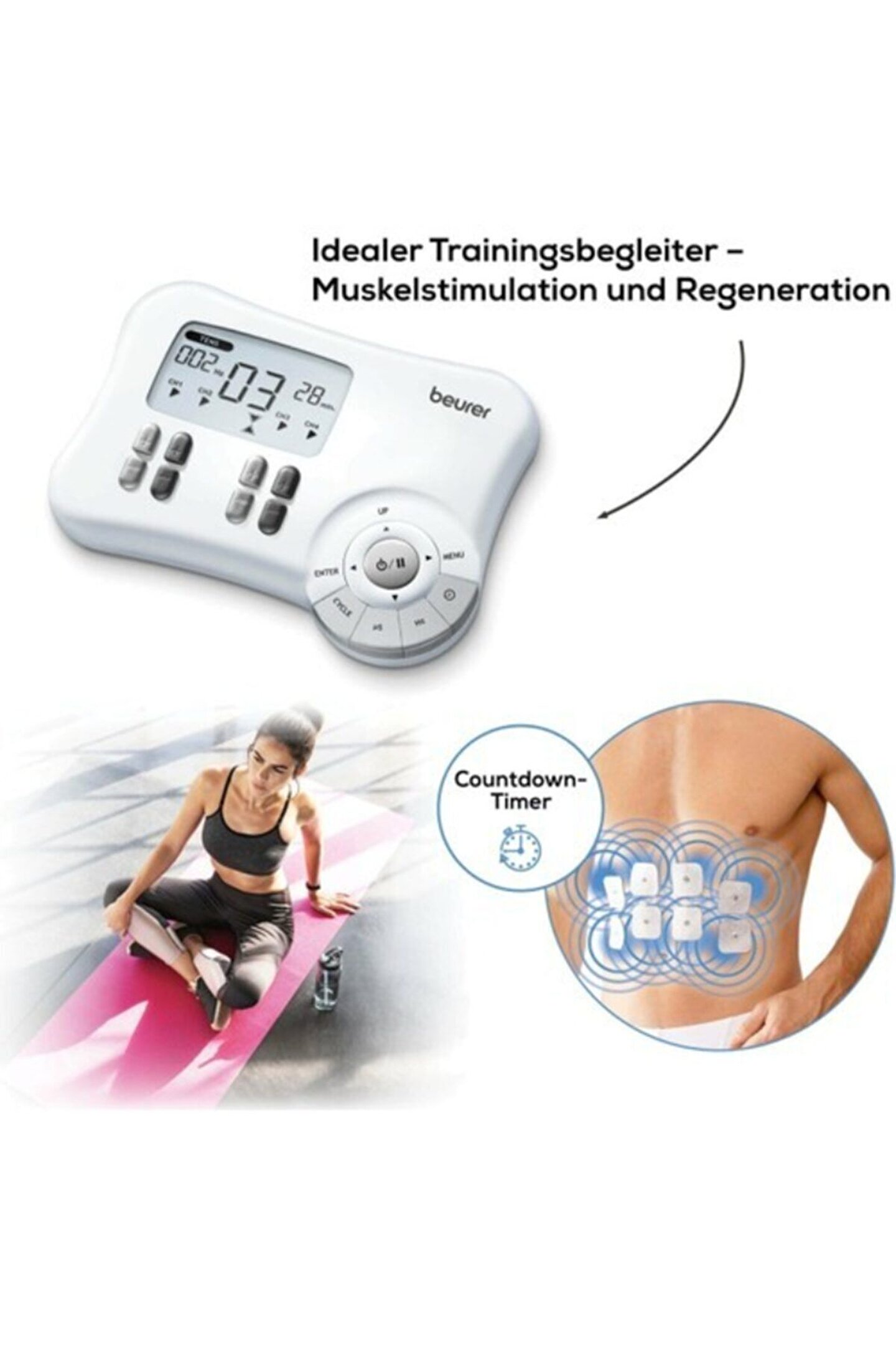 Beurer EM 80 TERAPİ / EMS Aleti ve 8'li set 45x45 Yedek Elektrodlar 3’ü 1 arada Ağrı terapisi Kas stimülasyonu (EMS) Rahatlama ve masaj Kendinden yapışan jel elektrotlar 8 adet dahil (45 x 45 mm) • 4 ayrı ayarlanabilir kanal • 30 adet önceden programlanmış uygulama • 20 adet kişiselleştirilebilir program: Programlanabilir frekans, puls genişliği, açılma/kapanma zamanı • Güvenlik kapaması • Ayarlanabilir yoğunluk / geri sayımlı zamanlayıcı • Saklama çantası • 3 adet 1,5 V AA pil dahil DİKKAT
