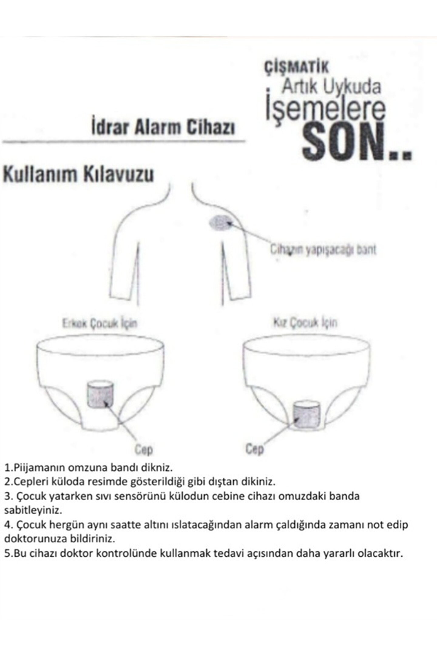 Ürün içeriği "çişeson cihazı 1 adet" "sabitleme bandı 3 adet" "kılıf 3 adet" 2 yıl garanti