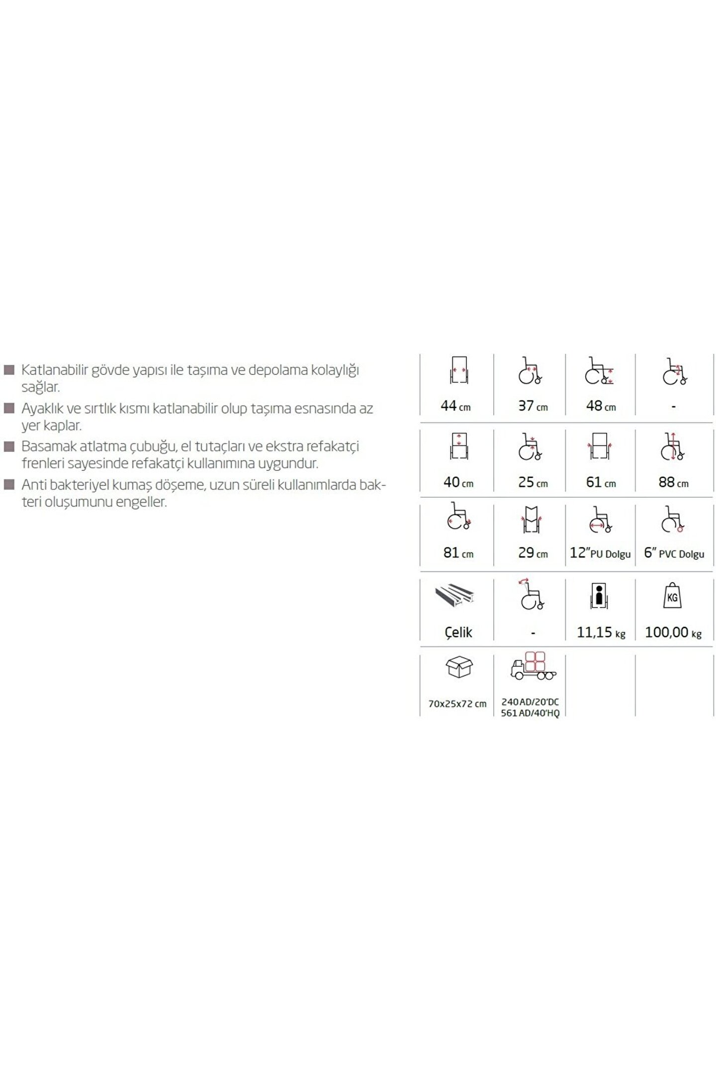 Alüminyum Transfer Sandalyesi ·Katlanabilir, dayanıklı ve hafif alüminyum gövde yapısı ile taşıma ve depolama kolaylığı sağlar. ·Ayaklık ve sırtlık kısmı katlanabilir olup taşıma esnasındaaz yer kaplar. ·Basamak atlatma çubuğu, el tutaçları ve ekstra birleşik refakatçi frenleri sayesinde refakatçi kullanımına uygundur. · kumaş döşeme, uzun süreli kullanımlarda bakteri oluşumunu engeller. Oturma Yeri Genişliği : 46 cm Oturma Yeri Derinliği : 40 cm Oturma Yeri Yüksekliği : 48 cm Oturma Yeri Açısı : - Sırtlık Yüksekliği : 40 cm Kolçak Yüksekliği : 19 cm Toplam Genişlik : 47 cm Toplam Yükseklik : 90 cm Toplam Uzunluk : 96 cm Katlanır Genişlik : 27 cm Arka Tekerlek : 12’’ PU Dolgu Ön Tekerlek : 6’’ PVC Dolgu Materyal : Aluminum Tilt Özelliği : - Ürün Ağırlığı : 10.00 kg Maksimum Taşıma Kapasitesi : 100.00 kg Koli Ölçüleri : 72×25×74 cm Konteyner Yükleme Adetleri : 216 AD/20’DC, 528 AD/40’HQ