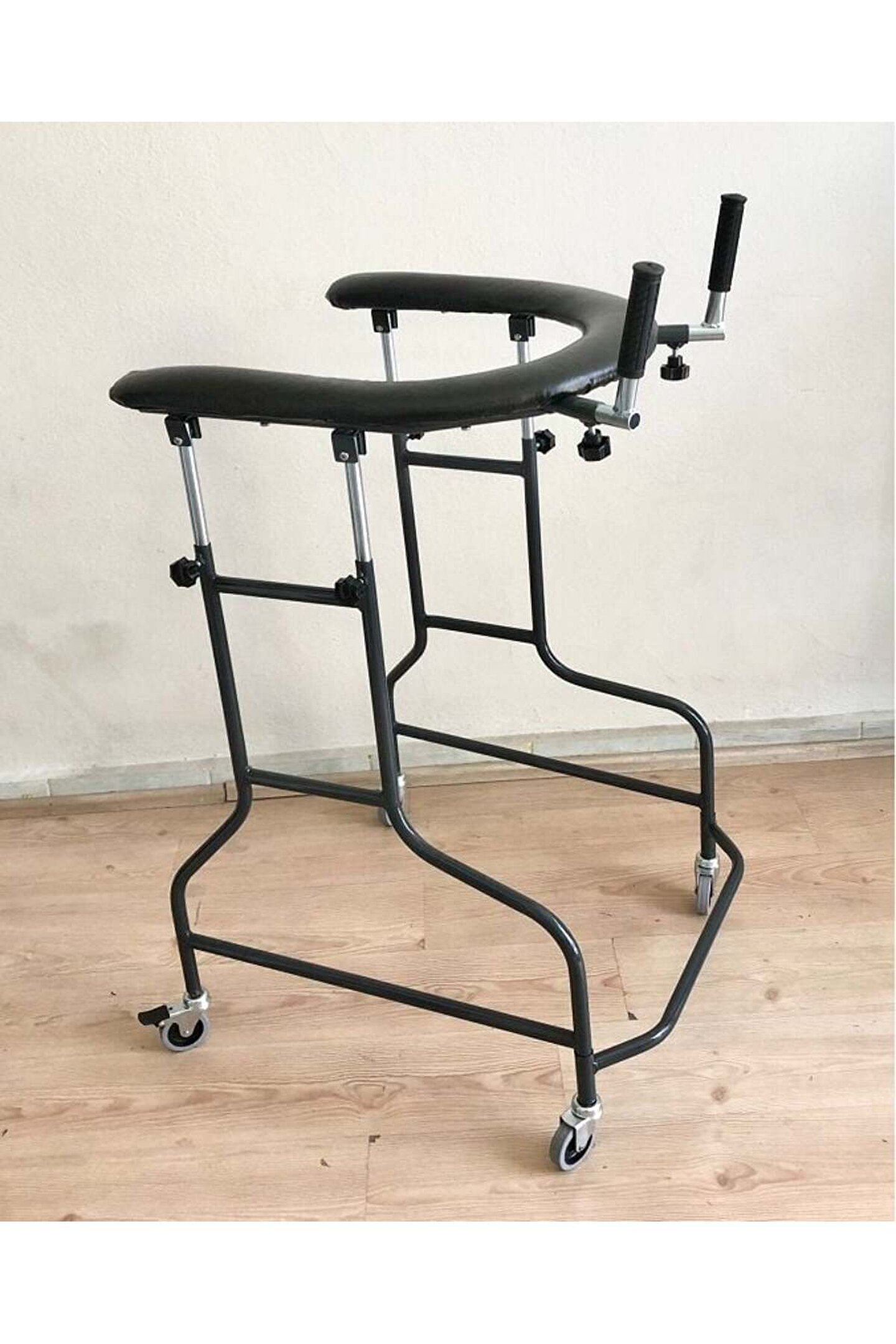 Haraketli Yürüme Cihazı Haraketli Yürüme Cihazı Haraketli Yürüme Cihazı Aksillar Destekli Walker Ürün Açıklaması ve Kullanım Alanı Çelik gövde katlanabilir ve yüksekliği ayarlanabilir, sırt ve oturma destekli, 4 Tekerlekli yetişkin yürüteçi. ; Güçlü ve dayanıklıdır. ; Kullanıcının farklı yükseklik gereksinimleri karşılamak için ayarlanabilir. ; Ameliyat sonrası rehabilitasyon egzersizlerinde, yürüme zorluğu çeken hastaların yürümeye başlamasına yardımcı olur. ; Gövde Yapısı Çelik gövde. ; Gövde Rengi Gövde krom nikel kaplı, el tutamaçları siyak rekli, tekerlekler gri renk. ; Döşemesi sihay vinlex deri kaplı. ; Demonte Özelliği Demonte Oturma Desteği istenildiğinde sökülüp takılabilen 5 cm kalınlığında, 20 cm eninde ve 55 cm genişliğinde yumuşak üstü siyah vinleks deri kaplı oturma tablası vardır. ; Kolçaklar 10 cm genişliğinde 6 cm yüksekliğinde ''U'' şeklinde yan ve ön kısmı çevreleyen yumuşak sünger üstüne vinleks deri malzeme kaplanmıştır. ; 10 kademe yükseklik ayarlı, 98 cm ile 121 cm arası istediğiniz ölçüde ayarlanabilir. ; El Tutamakları Ergonomik, yumuşak, siyah renkli süngerden imal edilmiştir. ; Yükseklik ayarlı, 100 cm ile 125 cm arası istediğiniz ölçüde ayarlabilir. ; Ön Teker 3 inç (7,5cm) gri renkli yerde iz yapmayan, 360 derece kendi etrafında dönebilen dolgu ön teker. ; Arka Teker 3 inç (7,5cm) gri renkli yerde iz yapmayan 360 derece kendi etrafında dönebilen ve kilitli dolgu arka teker. ; Garanti 2 yıl ürün garantisi, 10 yıl yedek parça bulundurma garantisi var.;