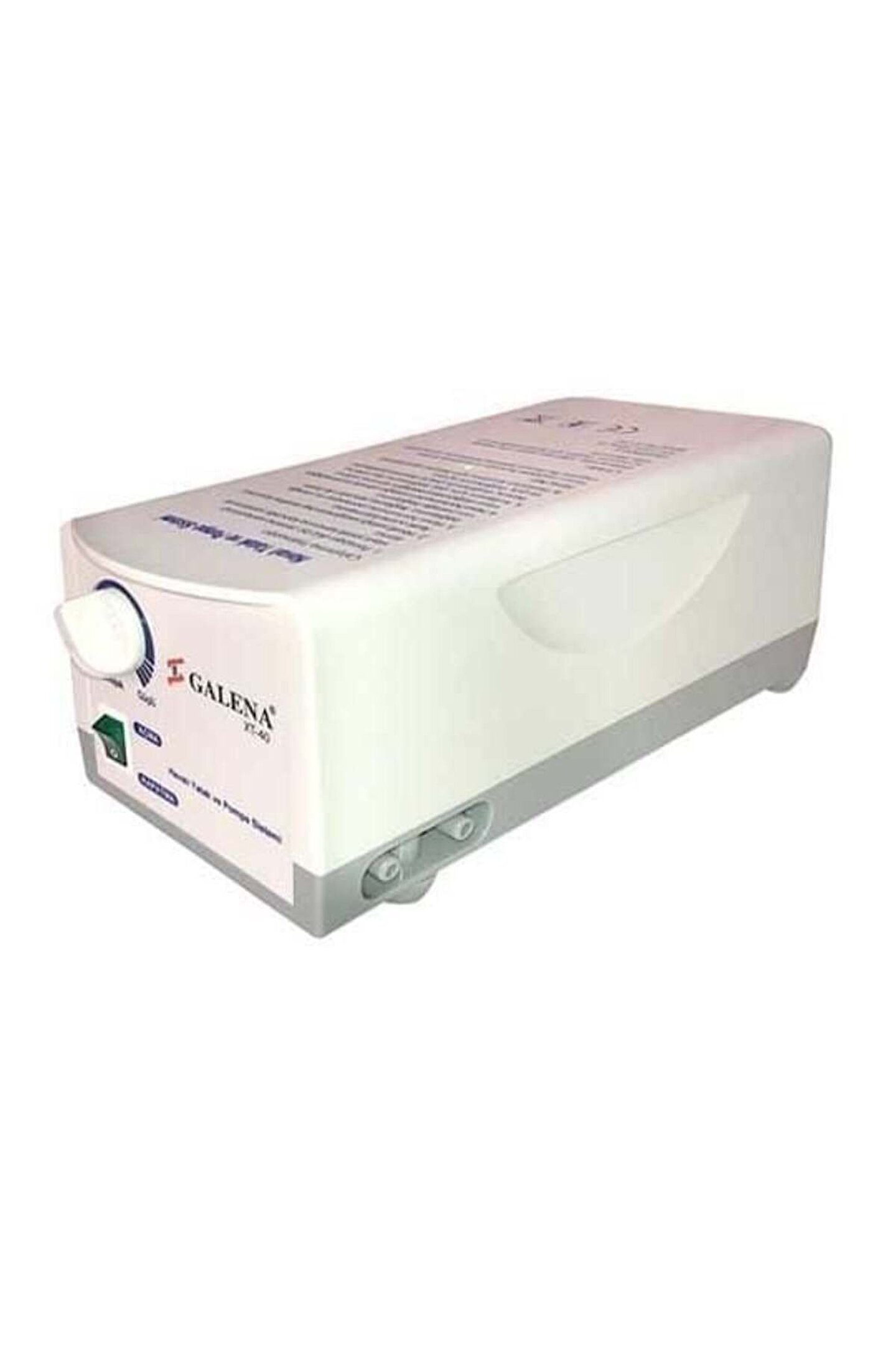 – Galena XT-30 serisi yüksek kaliteli ve ekonomik bir hava motorlu yatak sistemidir. – Yatak yaralarını ve ağrılarını engellemek için üretilmiştir. – 24 saat boyunca basınç bölgesi üzerinde etkilidir. – Hastanın ağırlığı ve yara derecesine göre basınç, ayar düğmesi vasıtası ile ayarlanabilir. – Yatakta oluşabilecek patlaklar için yedek parçalar ve yapıştırıcı kutu içerisinde ek olarak verilmiştir. Teknik Özellikleri : Pompa Yatak Ürün : Aries-5 düğmeli Ürün : Effect 2500 Güç Kaynağı : 220V/50 Hz Ebat : 280cm(U) x 90cm(G) x 6,5cm(Y) Hava Çıkışı : 4.5lt/dak 130 hava hücreler Basınç Scalası : 40 mmHg – 130 mmHg Hava alma delikleri ve uç kapakları yok Çevrim Zamanı : 12 dakika Malzeme : PVC(EN-71,Düşük toksik) Güç Tüketimi : 7W PVC kalınlığı : 0,30 mm Sigorta : 1 A Renk : Bej Ebat : 24cm(U) x 12cm(G) x 9,5cm(Y) Tamirat alet takımı ile beraber Ağırlık : 1 kg Ağırlık : 2 kg.