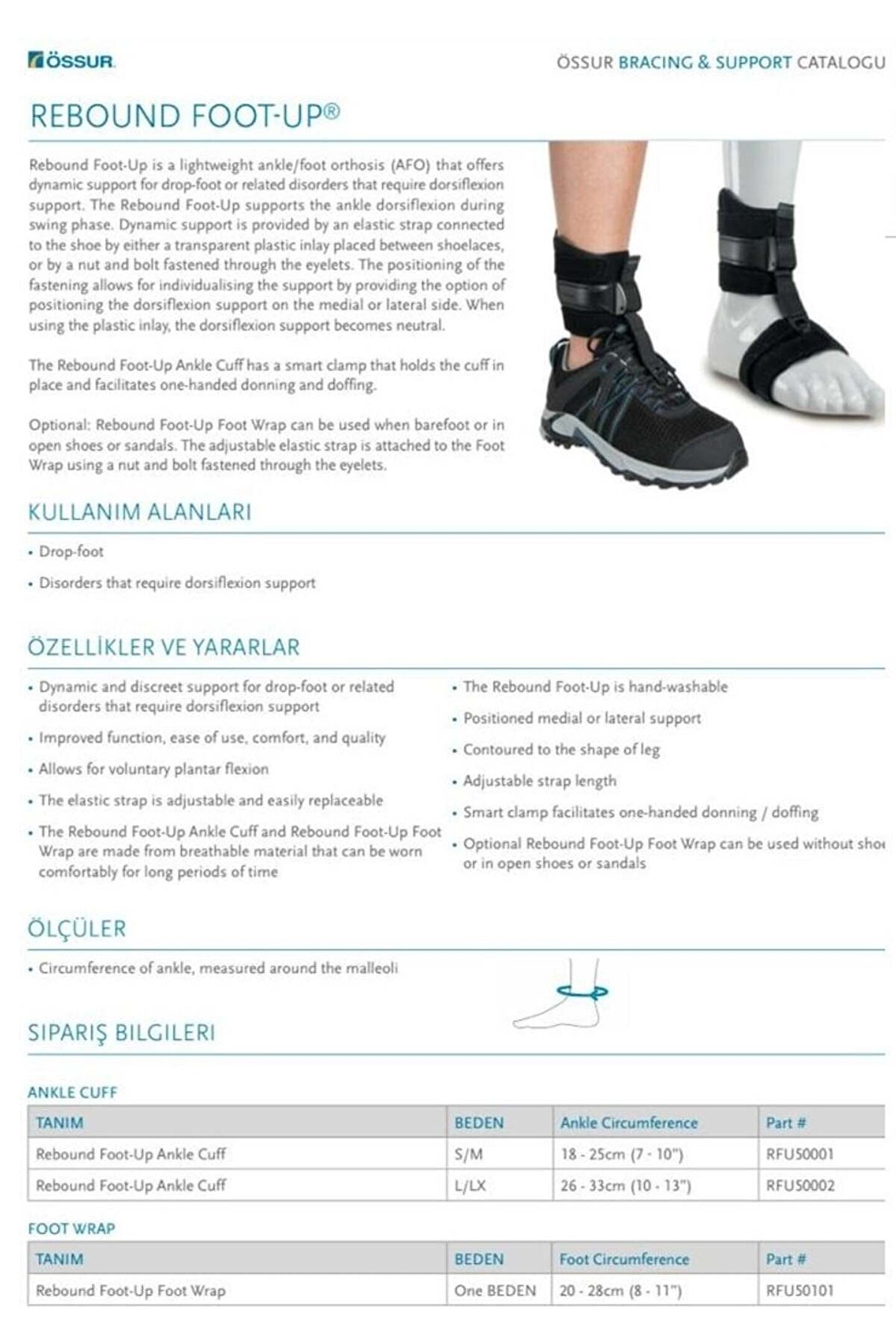 Rebound Foot-Up Düşük Ayak Bilekliği-Ayakkabı LARGE/XLARGE Rebound Foot-Up, ayak bileği veya dorsifleksiyon desteği gerektiren ilgili hastalıklar için dinamik destek sunan hafif bir ayak bileği / ayak ortezidir (AFO). ; Ribaund Foot-Up, dönüş aşamasında ayak bileği dorsifleksiyonunu destekler. ; Dinamik destek, ayakkabıya bağlanmış elastik bir kayışla ya ayakkabı bağları arasına yerleştirilmiş şeffaf bir plastik dolgu ya da deliklere tutturulmuş bir somun ve cıvata ile sağlanır. ; Bağlamanın konumlandırılması, dorsifleksiyon desteğini medial veya lateral tarafta konumlandırma seçeneği sağlayarak desteğin kişiselleştirilmesine izin verir. ; Plastik iç dolgu kullanıldığında, dorsifleksiyon desteği nötr hale gelir. ; Elastik kayış ayarlanabilir ve kolayca değiştirilebilir. ; Ribaund Foot-Up Ayak Bileği Manşeti, manşeti yerinde tutan ve tek elle takma ve çıkarma işlemlerini kolaylaştıran akıllı bir kıskaç içerir. ; İsteğe bağlı Rebound Foot-Up Foot Wrap, yalınayak veya açık ayakkabı veya sandaletlerde kullanılabilir. ; Ayarlanabilir elastik kayış, halkalara tutturulmuş bir somun ve cıvata kullanılarak Ayak Sargısına takılır. ; Rebound Foot-Up Ayak Bileği Manşeti ve Rebound Foot-Up Ayak Bağı uzun süre rahatça giyilebilen nefes alabilir malzemeden yapılmıştır. ; Rebound Foot-Up elde yıkanabilir. ; Kullanım endikasyonları Düşük ayak Ürün vurgulamaktadır Ayak ya da dorsifleksiyon desteği gerektiren ilgili hastalıklar için dinamik ve gizli destek. ; Geliştirilmiş işlev, kullanım kolaylığı, rahatlık ve kalite. ; Gönüllü plantarfleksiyona izin verir. ; Konumlandırılmış medial veya lateral destek. ; Bacak şeklini şekillendirdi. ; Ayarlanabilir kayış uzunluğu Akıllı mengene tek elle takma / çıkarma işlemini kolaylaştırır. ; İsteğe Bağlı Rebound Foot-Up® Foot Wrap, ayakkabı olmadan veya açık ayakkabılar veya sandaletler içinde kullanılabilir. ; Hasta profili Düşük ayak hastaları (örneğin, inme sonrası hastalar ve MS, SCI ve serebral palsili hastalar). ; Not Ürün spastisiteli hastalar tarafından kullanılmak üzere tasarlanmamıştır. ; .;
