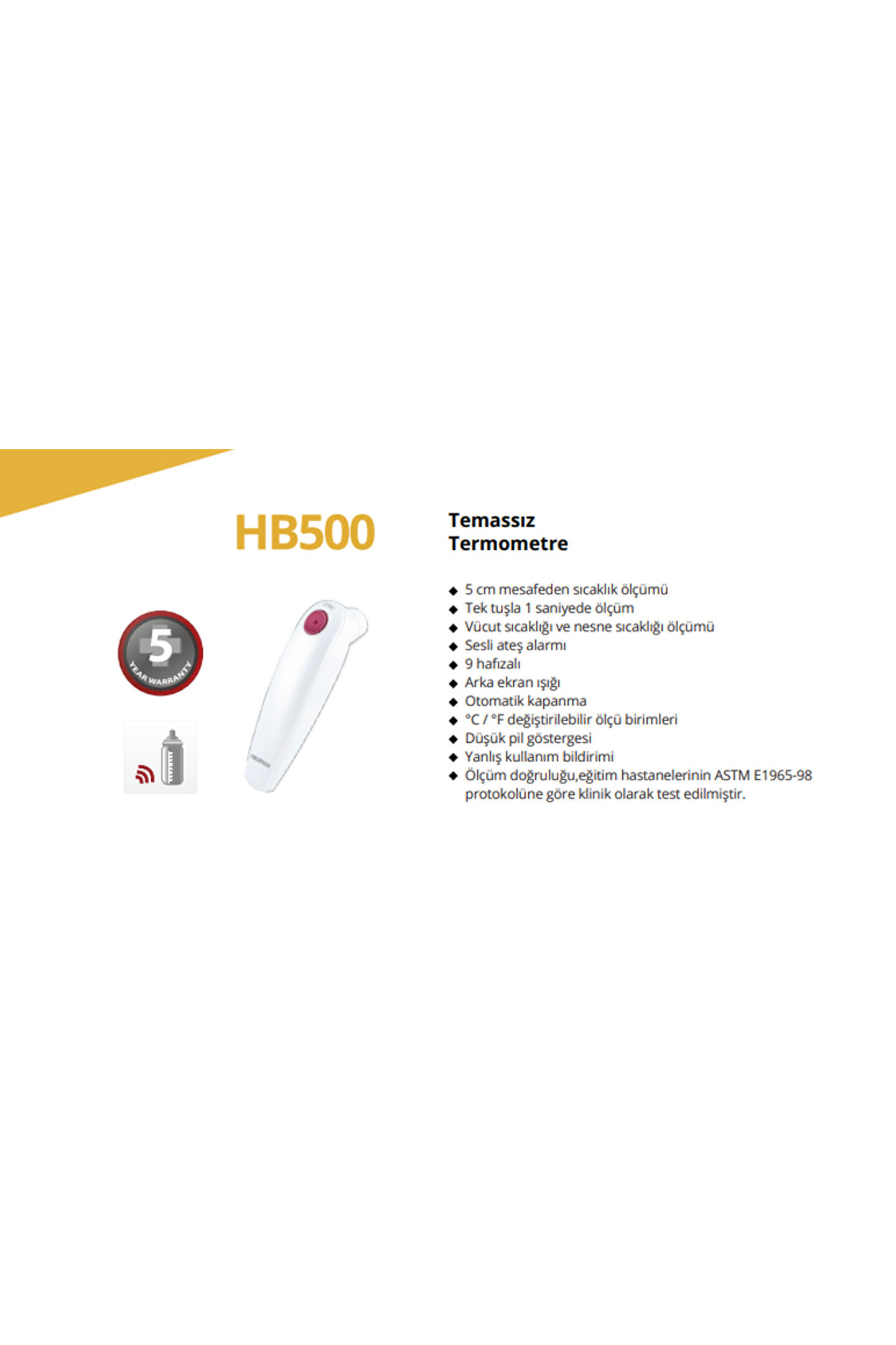 Rossmax HB500 Temassız Termometre, evde, Hastanede veya ihtiyaç duyulan her yerde kullanıma uygundur.; Dijital temassız ateş ölçer, vücudun veya nesnelerin sıcaklığını hızlı ve doğru bir şekilde ölçmenize yardımcı olur.; 1 saniyede ölçüm yapabildiği için hem yetişkinler hem de çocuklar için idealdir.; Vücut sıcaklığı ölçümü için alından ve nesne sıcaklığı ölçümü için ise yüzeyden ölçüm yapabilirsiniz.; Ateş alarmı sayesinde çocuğunuzun veya sevdiklerinizin ateşi yükseldiğinde sizi uyarır.; 9 hafıza özelliği ile önceki ölçümlerinizi takip edebilirsiniz.; Arka ışık özelliği karanlık ortamlarda rahat kullanım sağlar.; Otomatik kapanma özelliği ile pil ömrünü korur.; °C / °F seçimi sayesinde ölçümünüzü tercih ettiğiniz birimde yapabilirsiniz.; Düşük pil seviyesi bildirimi, pil değişim zamanı geldiğinde sizi uyarır.; Temel Özellikler: Ölçüm mesafesi 5 cm (2 inç) dahilinde 1 saniyelik ölçüm Vücut sıcaklığı ölçümü Nesne Sıcaklığı ölçümü Hızlı ve doğru ölçüm 9 hafıza Arka ışık Ateş alarmı ile ateşin erken teşhisine yardımcı olur Pilden tasarruf etmek için otomatik kapanma °C / °F seçimi Temassız kullanım sayesinde hijyenik Kolay ve pratik kullanım Uzun pil ömrü Dayanıklı ve güvenilir 3 yıl garanti ASTM E1965-98:2009 düzenleme standardı protokolüne dayalı olarak birçok büyük eğitim hastanesinde klinik olarak test edilmiştir.;
