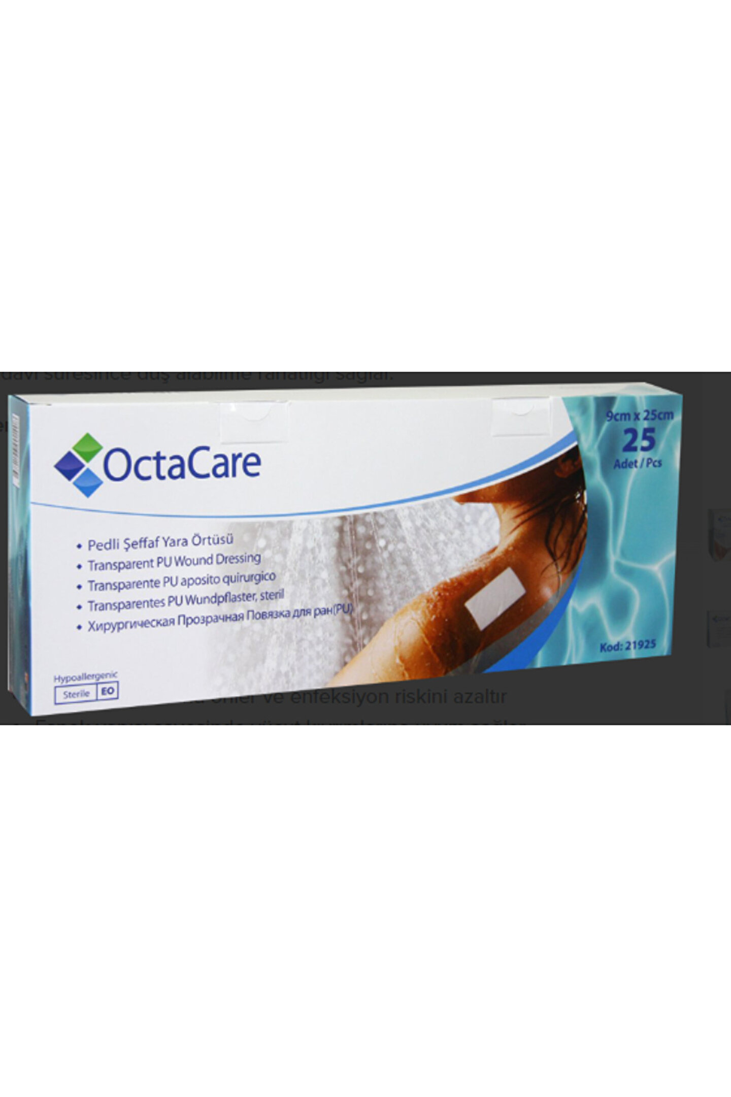 OctaCare Şeffaf Yara Örtüsü, şeffaf Poliüretan malzemeden üretilmiştir. Şeffaf yapısı sayede uygulanan bölgenin sürekli gözlemlenebilir olmasını sağlar. Esnek yapısı sayesinde vücut kıvrımlarına uyum sağlar. Ameliyat sonrasında dikişli bölgelerin korunmasında ve hastanın kendi kendine yapabileceği pansuman değişimlerinde kullanılabilir. Yaranın su ile temasını önlediğinden tedavi süresince duş alabilme rahatlığı sağlar.