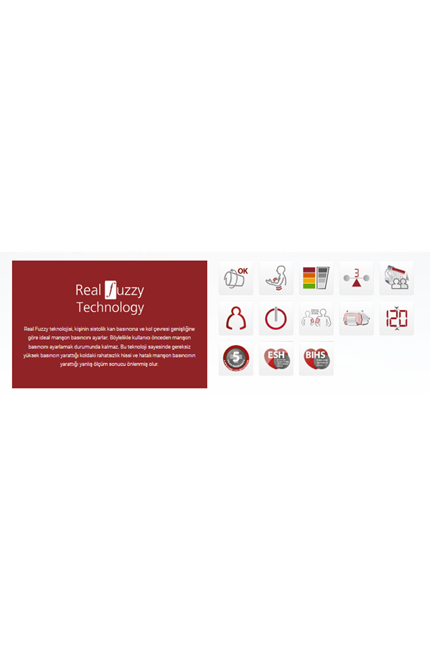 Real-Fuzzy Teknolojisi: Real Fuzzy teknolojisi, kişinin sistolik kan basıncına ve kol çevresi genişliğine göre ideal manşon basıncını ayarlar. Böylelikle kullanıcı önceden manşon basıncını ayarlamak durumunda kalmaz. Bu teknoloji sayesinde gereksiz yüksek basıncın yarattığı koldaki rahatsızlık hissi ve hatalı manşon basıncının yarattığı yanlış ölçüm sonucu önlenmiş olur.