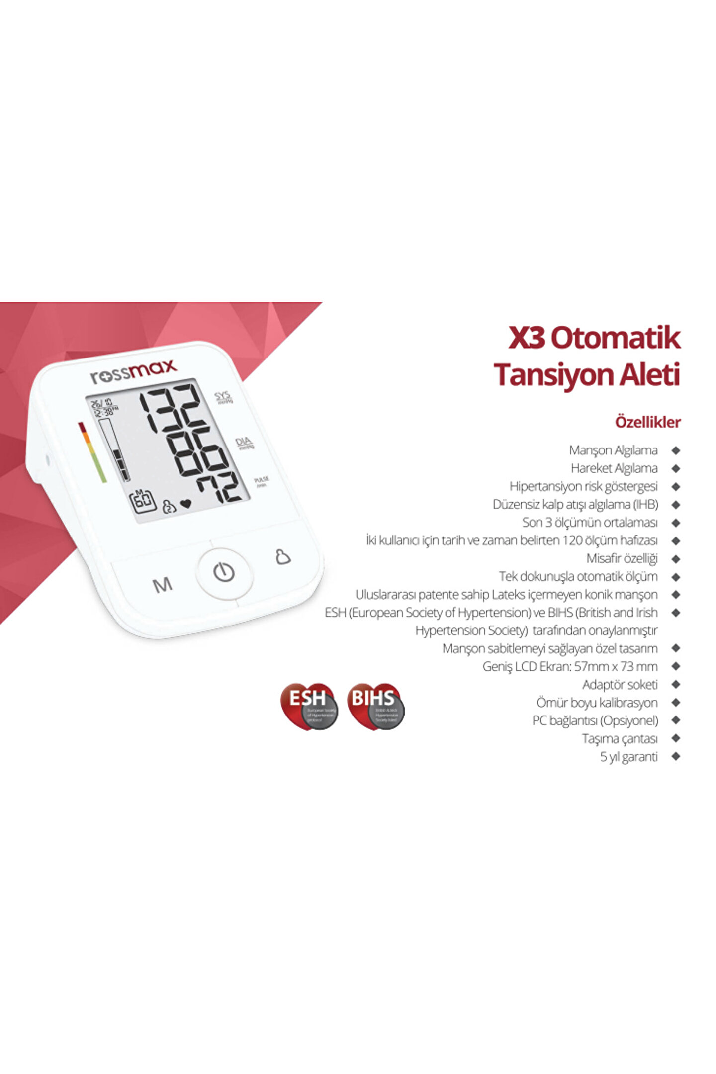 Yüksek tansiyon risk faktörleri ve/veya yüksek tansiyonla ilgili durumlara sahip kişilerin takibi için idealdir. Rossmax Otomatik Tansiyon Aleti X1, yüksek teknoloji standartları ve kullanıcı dostu tasarımıyla, tansiyon takibinizi güvenilir bir şekilde gerçekleştirmenizi sağlar. Real-Fuzzy teknolojisi, manşon basıncını kişinin sistolik kan basıncına ve kol çevresi genişliğine göre otomatik olarak ayarlar. Bu sayede, gereksiz yüksek basınç ve hatalı ölçüm riski ortadan kaldırılır. . Ayrıca, Düzensiz Kalp Atışı algılama (IHB) ile de kalp sağlığınıza dair bilgi sunar. 24-40 cm genişliğindeki manşon çapı ve latex içermeyen patentli konik manşon tasarımı, çeşitli kullanıcı ihtiyaçlarına uygun bir ölçüm deneyimi sunar. Hem pil hem de adaptör ile çalışabilme özelliği sayesinde, enerji kaynağı konusunda da esneklik sunar.