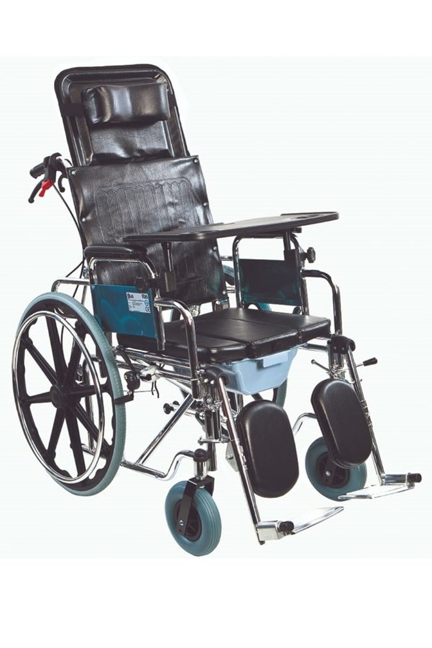 Golfi-4(G 124) Multi-fonksiyonel Tekerlekli Sandalye Uzun süreli kullanımlarda kullanıcı rahatlığı göz önünde bulundurularak tasarlanmış sırtlık kısmı 6 kademede 160° yatırılarak şezlong pozisyonu alabilmektedir. Kullanıcının baş yapısına uygun ergonomiklikte pozisyonlandırılabilir başlığa sahiptir. Çıkarılabilir kolçaklar kullanıcının yatak, araba vb. alanlara transferini kolaylaştırır. Çıkarılabilir ayaklıkları sayesinde asansör vb. dar alanlarda ekstra manevra kabiliyeti sağlar. Ayaklıklar kullanıcı konforu düşünülerek, bacaklarını ileri doğru uzatabilmesine olanak sağlamak için 90° kaldırılabilir olarak tasarlanmıştır. Ayaklık ve baldırlık kısımları kullanıcı boyuna göre ayarlanabilir özelliktedir. 200*50 PU ön tekerlekler yüzeyi bozuk alanlarda ve mazgallarda rahat sürüş sağlar. Katlanabilir gövde yapısı taşıma ve depolama kolaylığı sağlar. Basamak atlatma çubuğu ve el tutaçları sayesinde refakatçi kullanımına uygundur. Eğimli alanlarda ve şezlong pozisyonunda kullanımı sırasında kullanıcının geriye düşmesini engelleyen anti-tipper tekere sahiptir. Kullanıcının tuvalet ihtiyacını karşılayabilmesi için lazımlık şeklinde oturma yeri ve koku önleyici kapaklı lazımlık kovasına sahiptir. vinil döşeme, uzun süreli kullanımlarda bakteri oluşumunu engelle Golfi-4(G 124) Multi-fonksiyonel Tekerlekli Sandalye