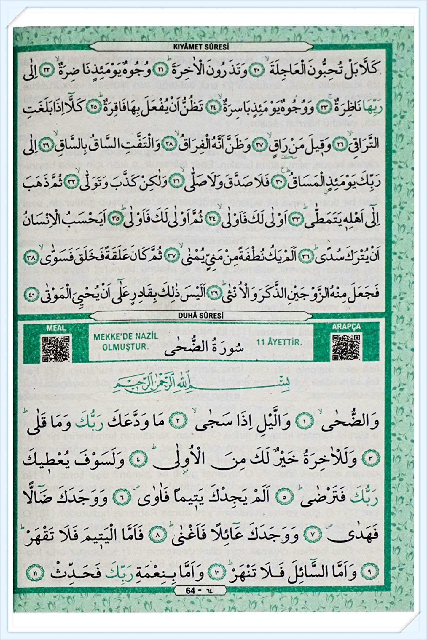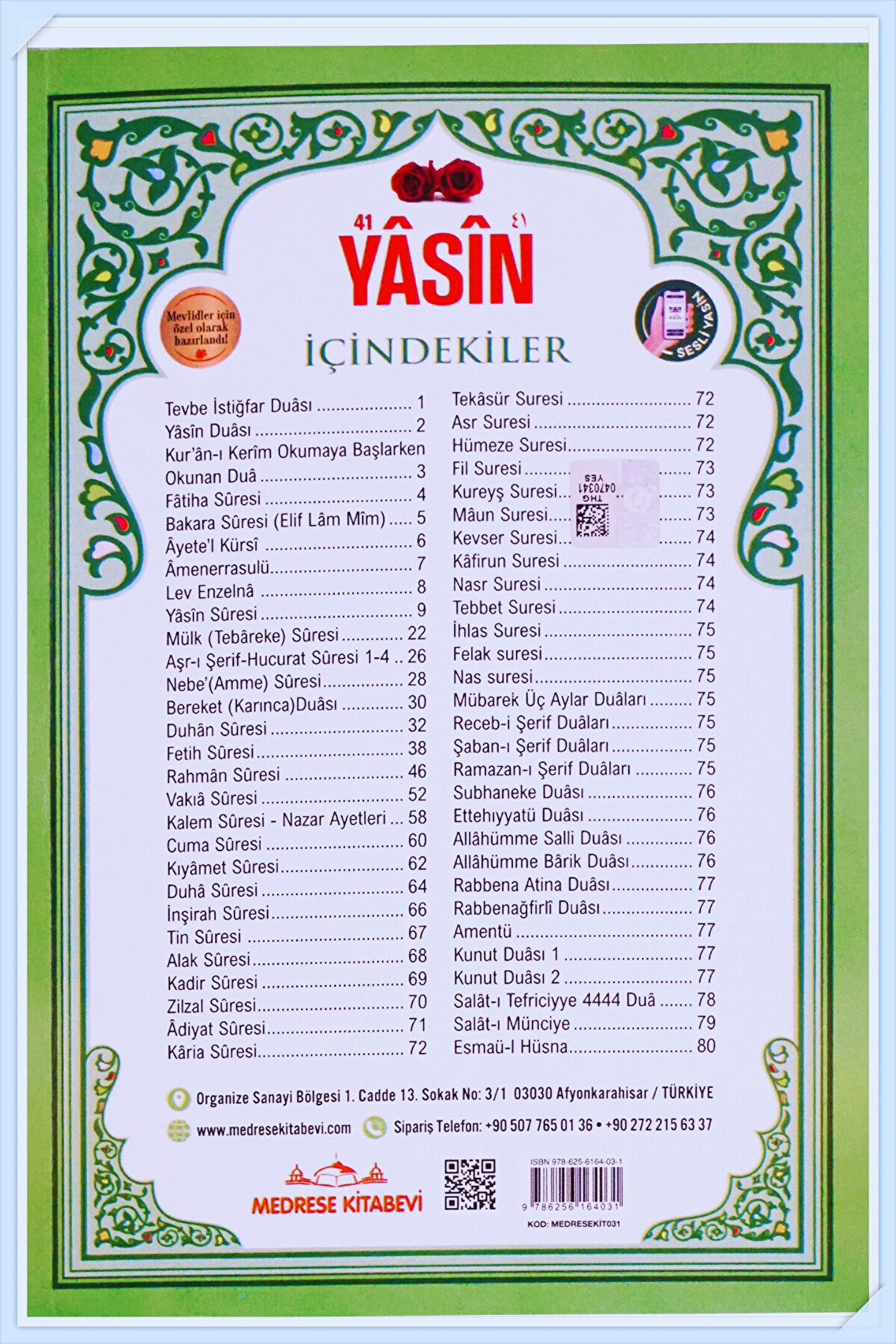 Ürünümüzün Genel Özellikleri: • Ebat: Orta boy 16*24 cm • Sayfa Sayısı: 80 sayfa • Kapak Kâğıdı: Selefonlu Amerikan Bristol Kapaktır.; ; • Kâğıt cinsi 55 gr İthal Kitap kâğıdıdır.; ; • Bilgisayar hatlı olup kolay okunabilir.; ; İri yazılı font ile yazılmıştır.; ; • Meal: Elmalılı M.; Hamdi Yazır • Arapça metin, Arapça okumayı bilmeyenler için Türkçe okunuşu ve Türkçe anlamı vardır.; ; Harekeler Harflerin Hemen Altında ve Üstünde Sıralanmıştır • Sayfalarımızda bulunan QR kod ile akıllı telefon veya tabletlerinizden Arapça okunuşunu ve Türkçe Mealini sesli olarak dinleyebilir ve takip edebilirsiniz.; ; • Arapça Metinde harekeler Harflerin Hemen Altında ve Üstünde Sıralandığından acemilik çekmeden ve hata yapmadan rahat okuyabilirsiniz.; ; • Kuranı Kerimi Okumaya Yeni Başlayanlar, acemilik çekmeden rahat okuyabilirler.