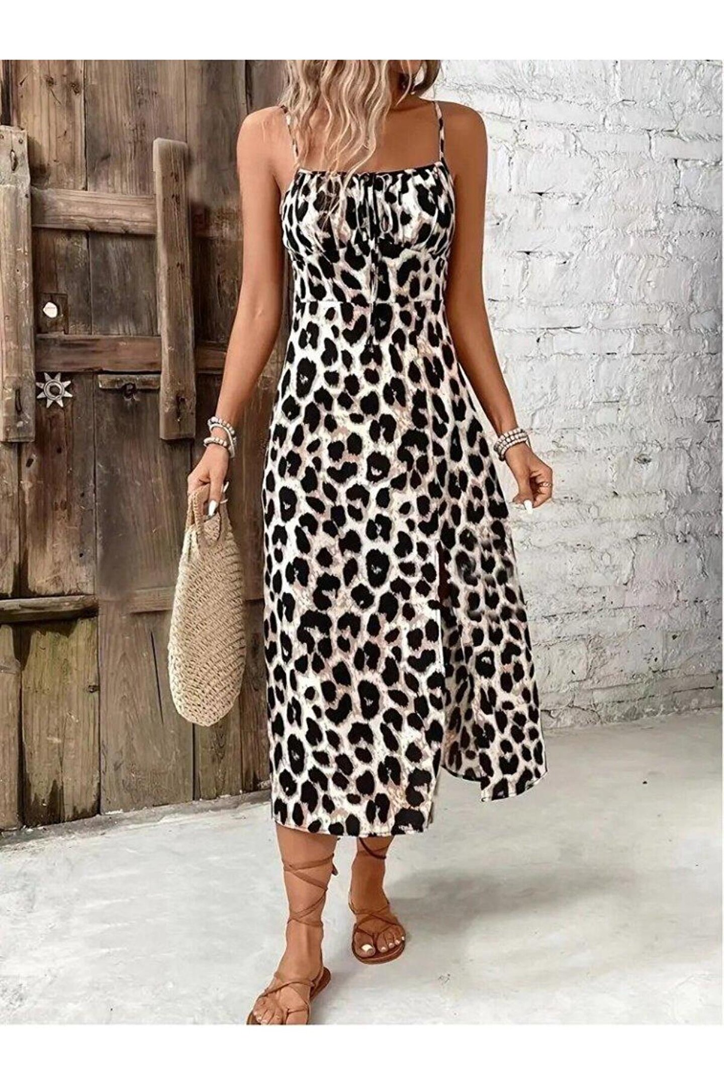 Kadın Askılı Yakadan Bağcıklı Yırtmaçlı Leopar Desenli Midi Süprem Elbise.; Ürün detayları ve kullanım hissi kişisel tercihlere göre değişiklik gösterebilir.