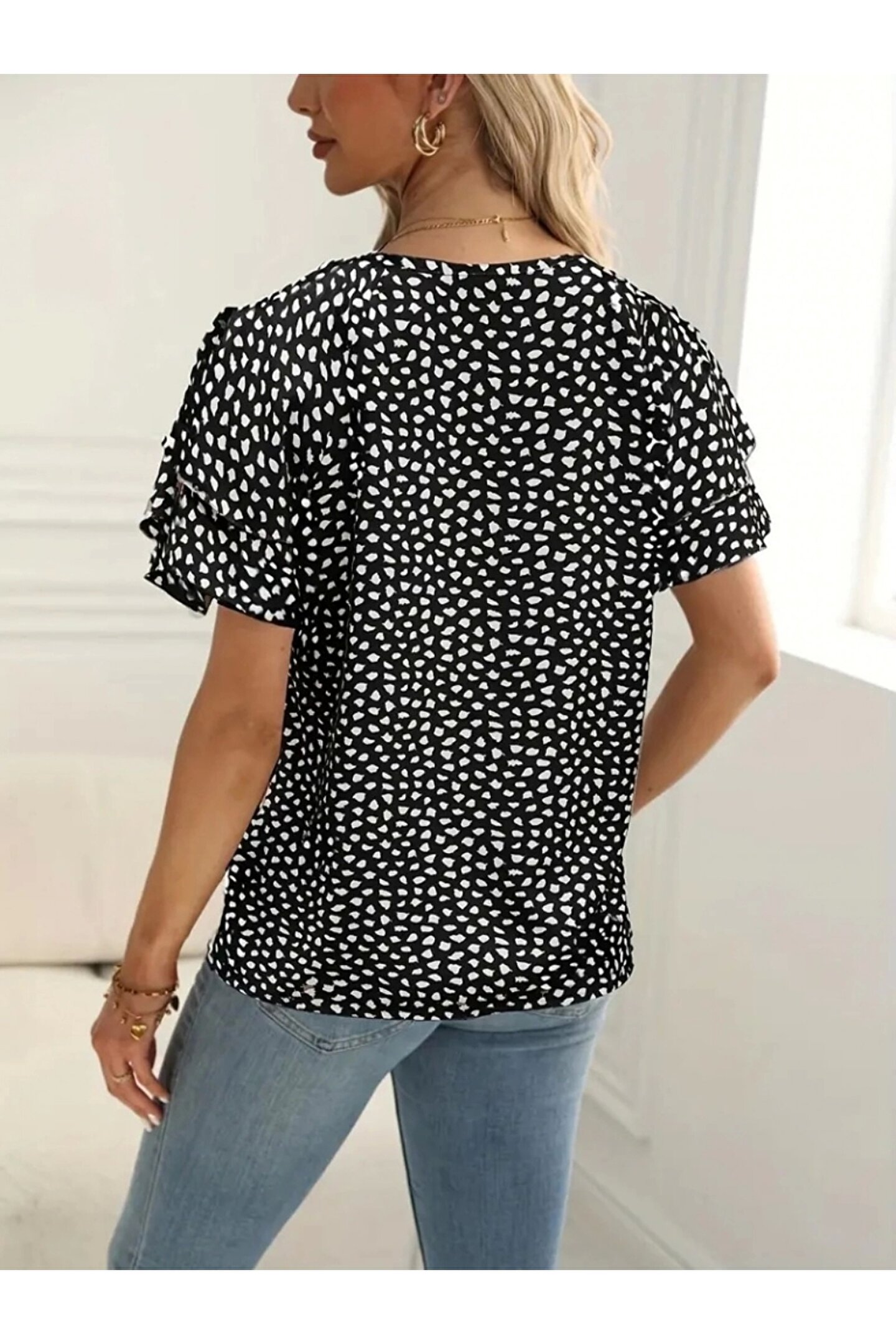 Kadın Kısa Kollu Kolları Volanlı Baskılı Süprem Bluz