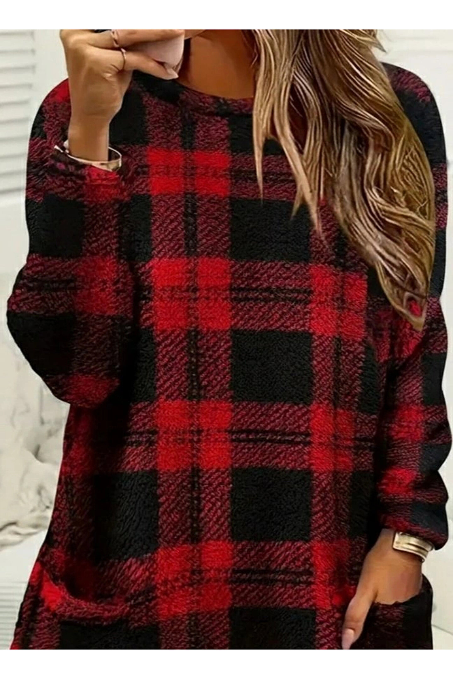 Kadın Uzun Kollu Yarı Balıkçı Yakalı Cep Detaylı Ekoseli Dokuma Tunik