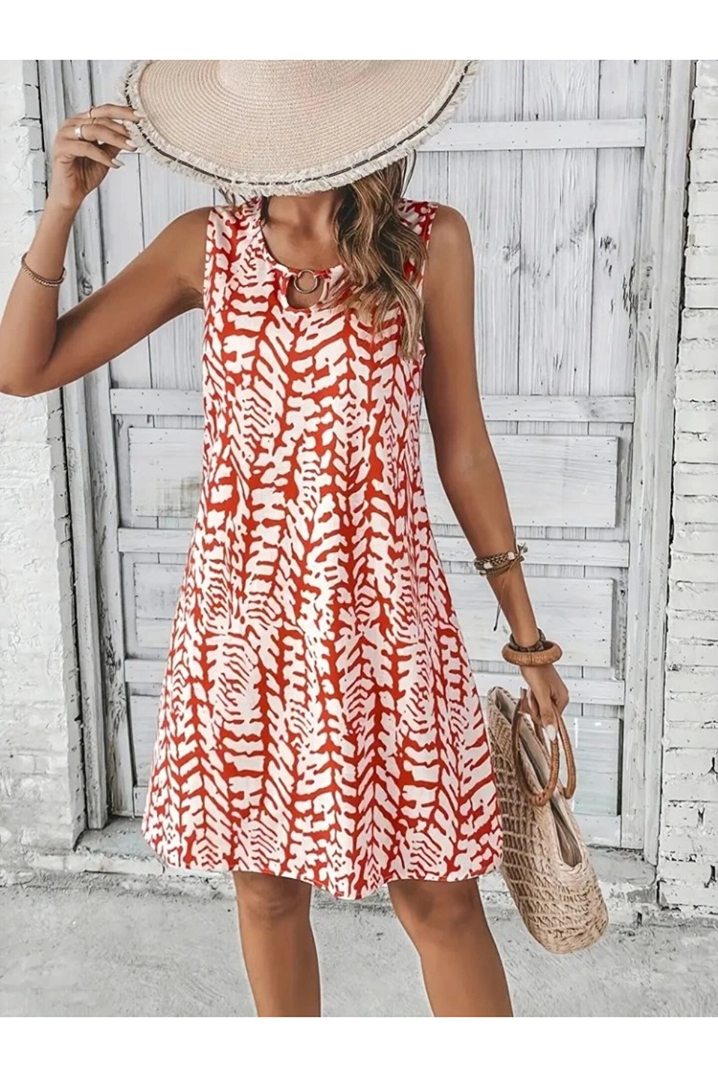 Kadın Sıfır Kol Yakadan Halka Detaylı Desenli Kısa Bürümcük Elbise