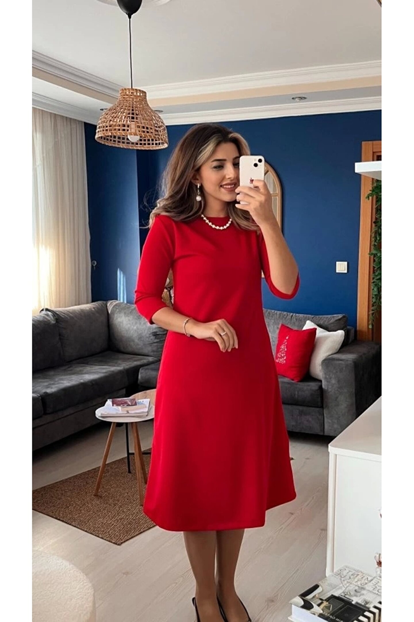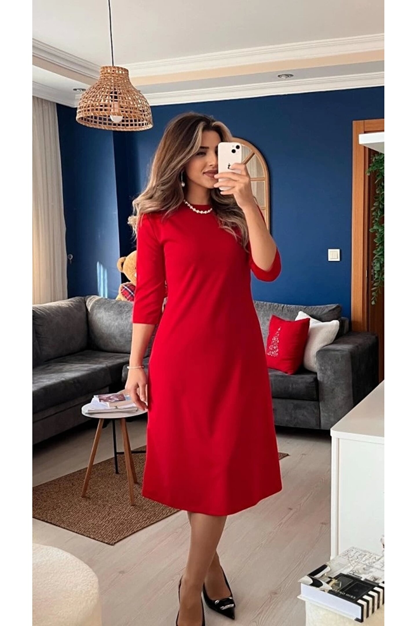 Kadın Uzun Kollu Bisiklet Yaka Midi Ithal Krep Elbise