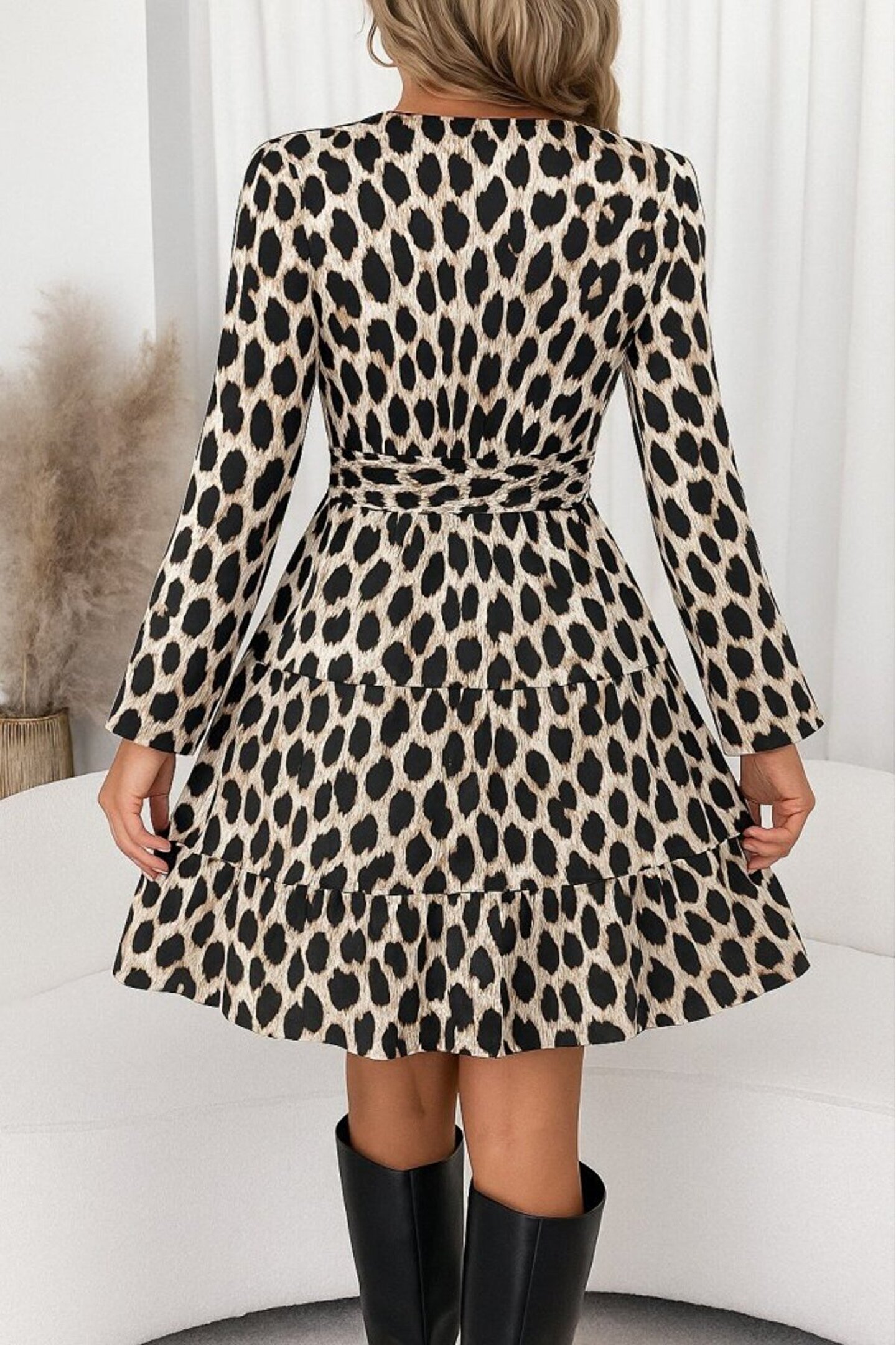 Kadın Uzun Kollu Kruvaze Yaka Desenli Mini Modal Elbise