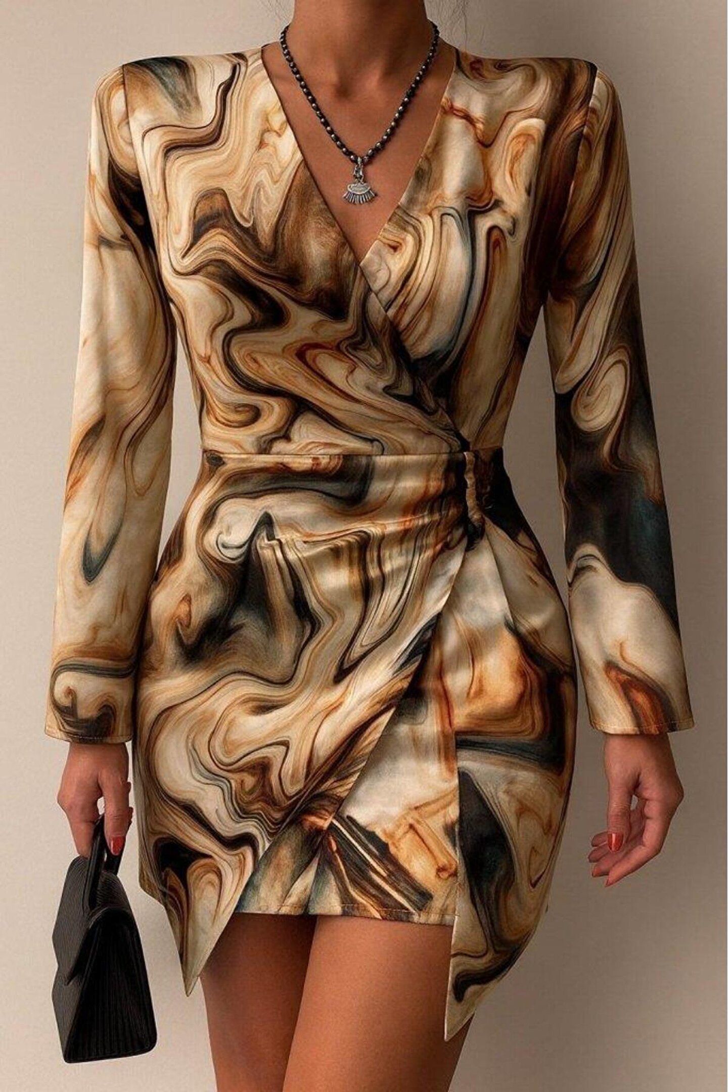 Kadın Uzun Kollu Kruvaze Yakalı Asimetrik Detaylı Mini Modal Elbise