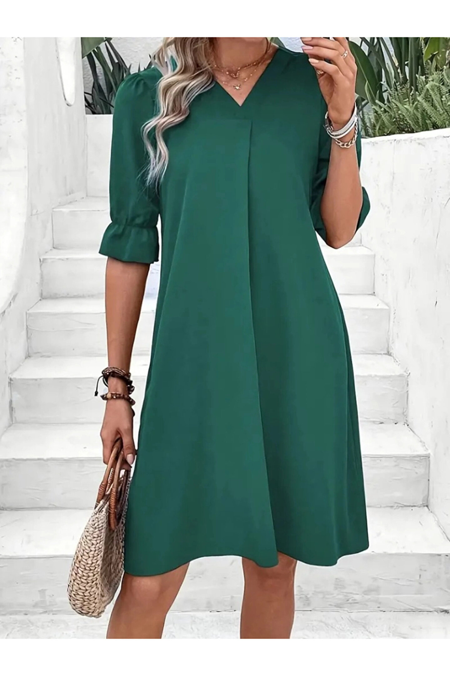 Kadın Kısa Kollu V Yakalı Salaş Janjan Krep Elbise