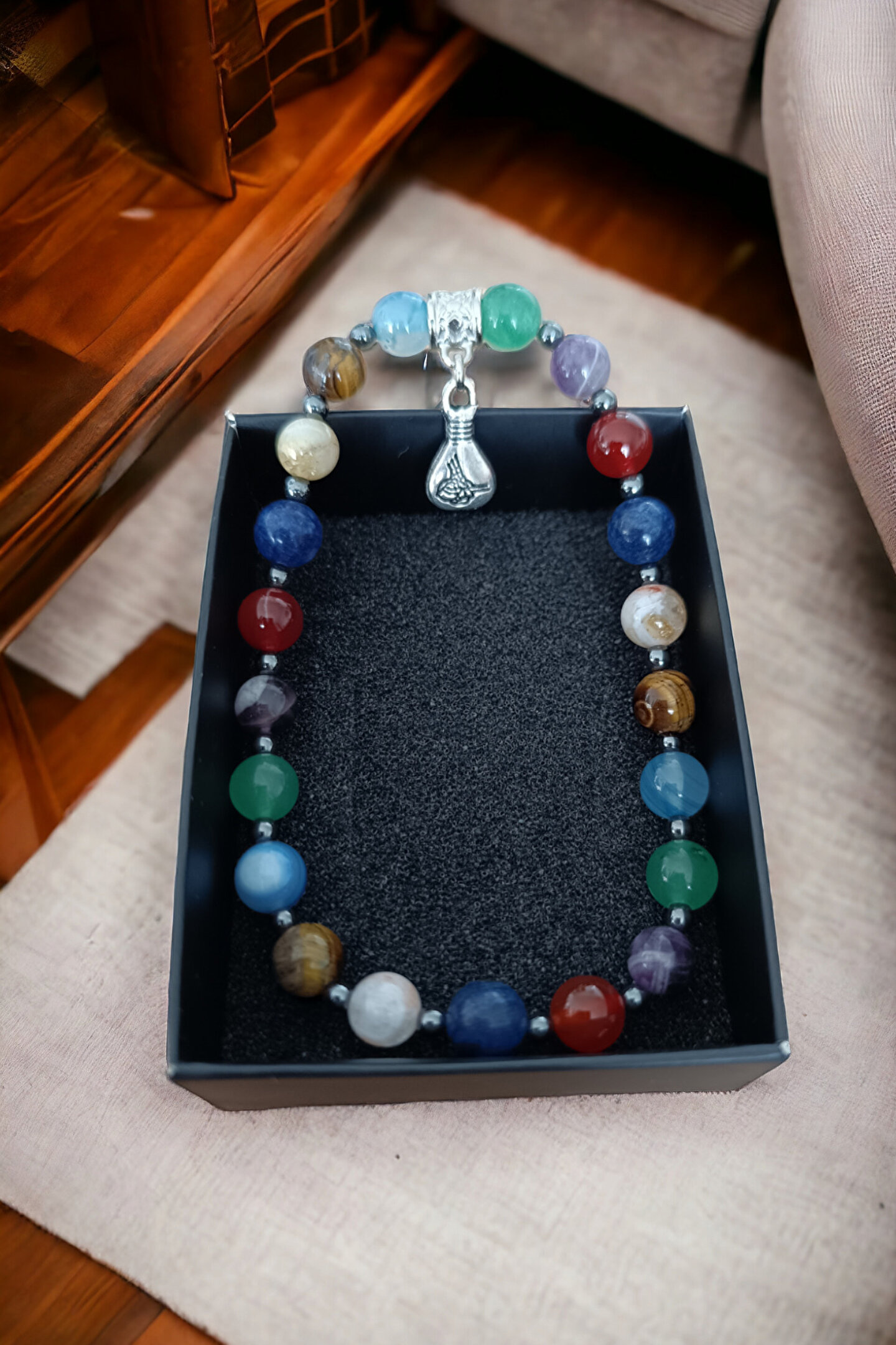 Tüm ürünler orijinal Sertifika ilegönderilir Faturanız kesilir Sisteme işlenir ; Taşlar : Kaplan gözü Taşı, Ametist, Aventurin Lapis, Sitrit, Mavi Akik, Akik, Hematit ; Kesim: Normal kesim model + yuvarlak kesim ; Taş boyutu : 8 mm - hematit disk 3 mm ; Taş sayısı : Bedenlere göre değişim olur ; Aparat: Metal Desenli ; Metal: Paslanmaz kaplama metallerdir ; Görüntü: Resim Ortalama 20-21 cm göreçekilmiştir bilek yapınıza göre ; ayarlanacak modelde taş +artı yada - eksi olabilir Bileklik ölçüsü: 16-17 cm - 18-19 cm -20-21 cm - 22-23 cm ; Sargı: 1 mm misina ipi Kalite: Doğaltaşlar ; Ürün içeriği: bileklik + sertifika +yedek misina ; Ambalajı: Seçenekler Mevcuttur ; Paket içeriği : 1 adet bileklik + 20-25cm uzunluğunda1 adet yedek misine ; İp: Esnek uzayıp kısalabilen misina herbileğe uyum sağlar bileği sıkmaz ; Ayrıca yedek misina gönderilmektedirbileklik bilek yapınıza göre yeniden tasarlayabilirsiniz ;
