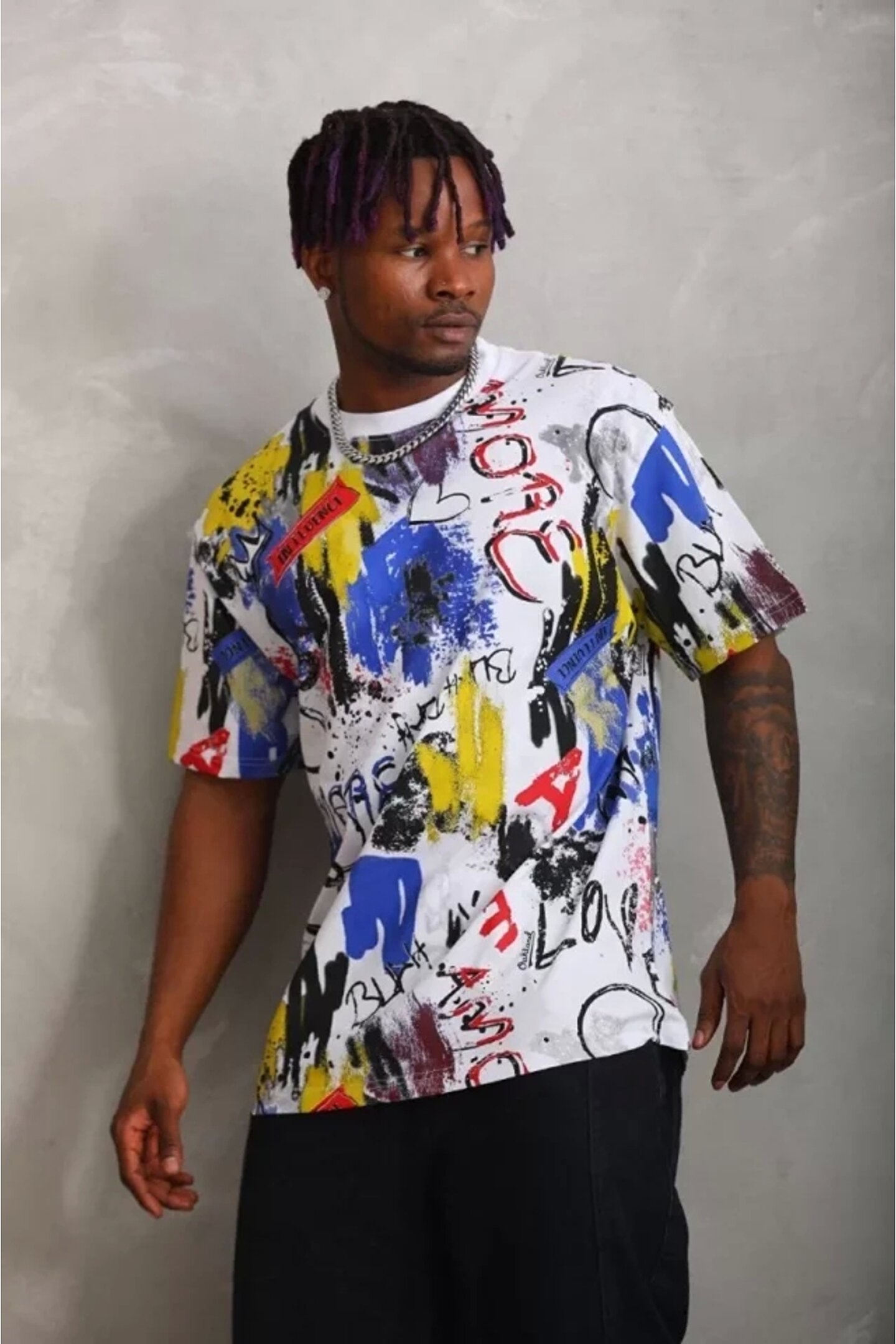 Unisex Oversize Baskılı Bisiklet Yaka T-Shirt - Beyaz