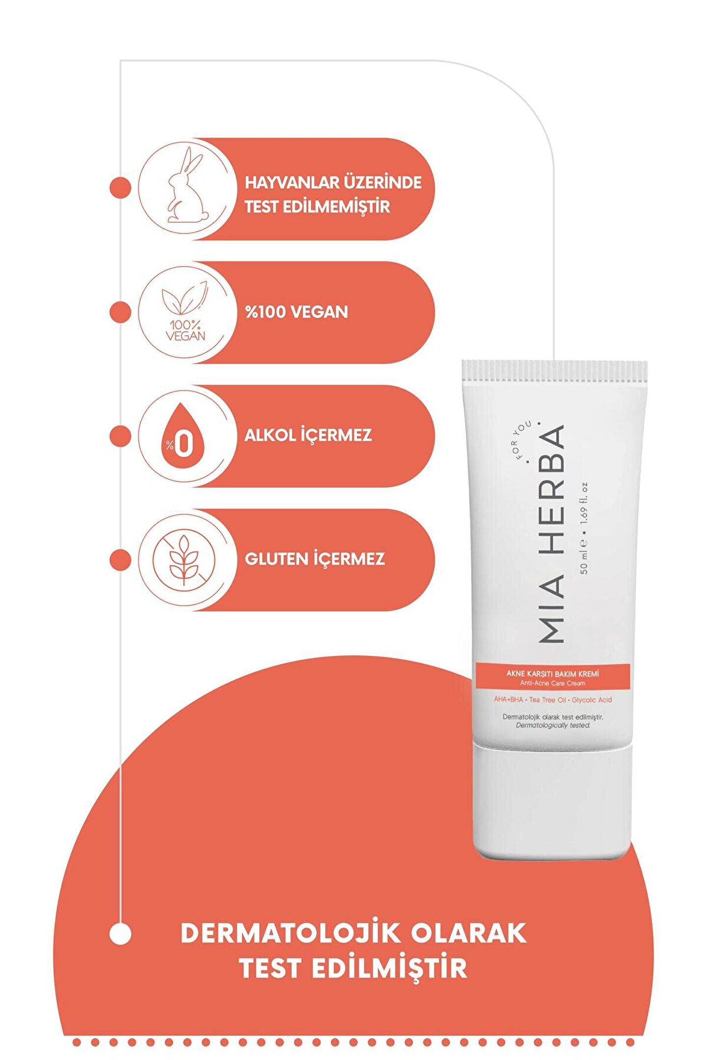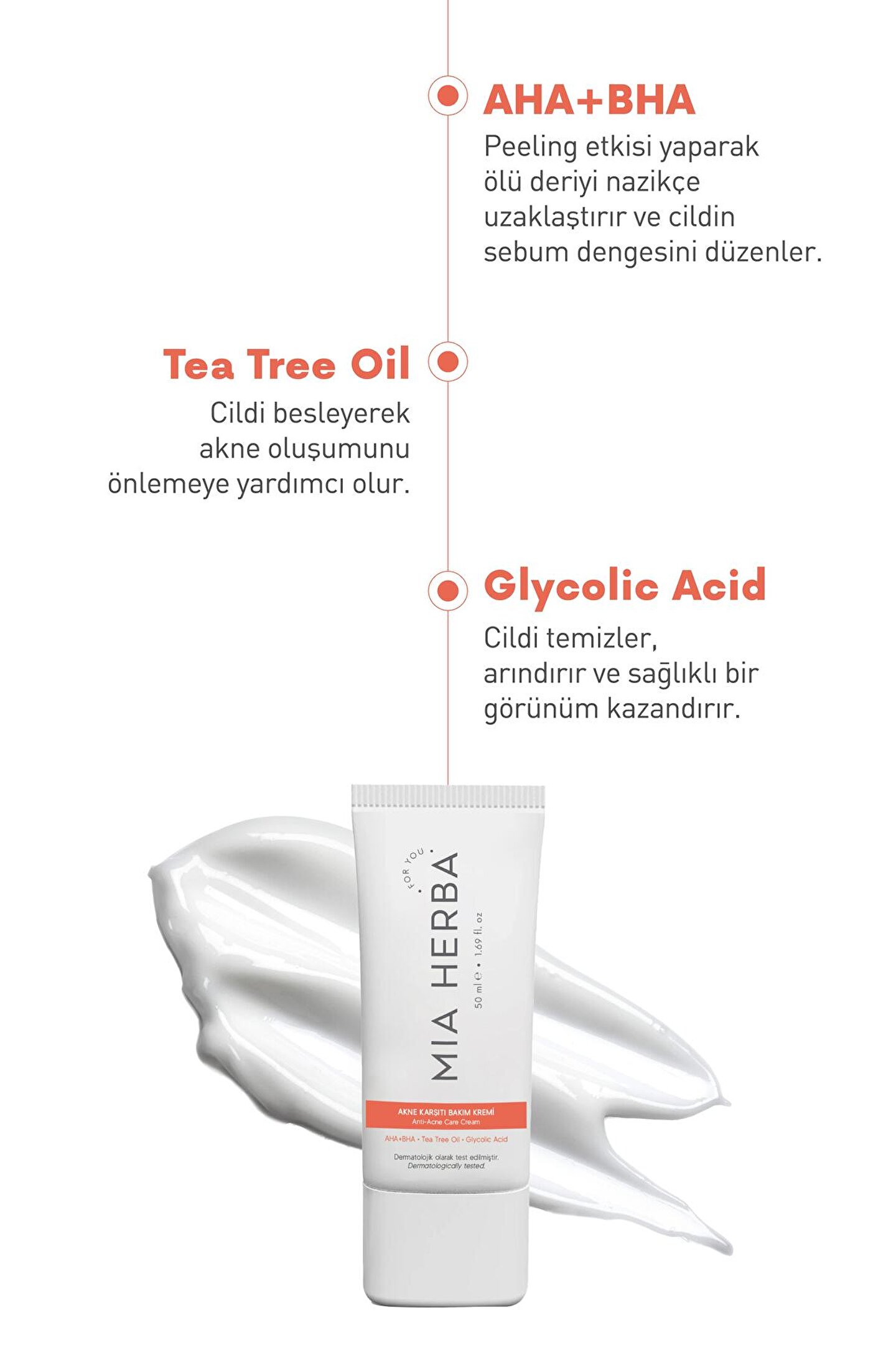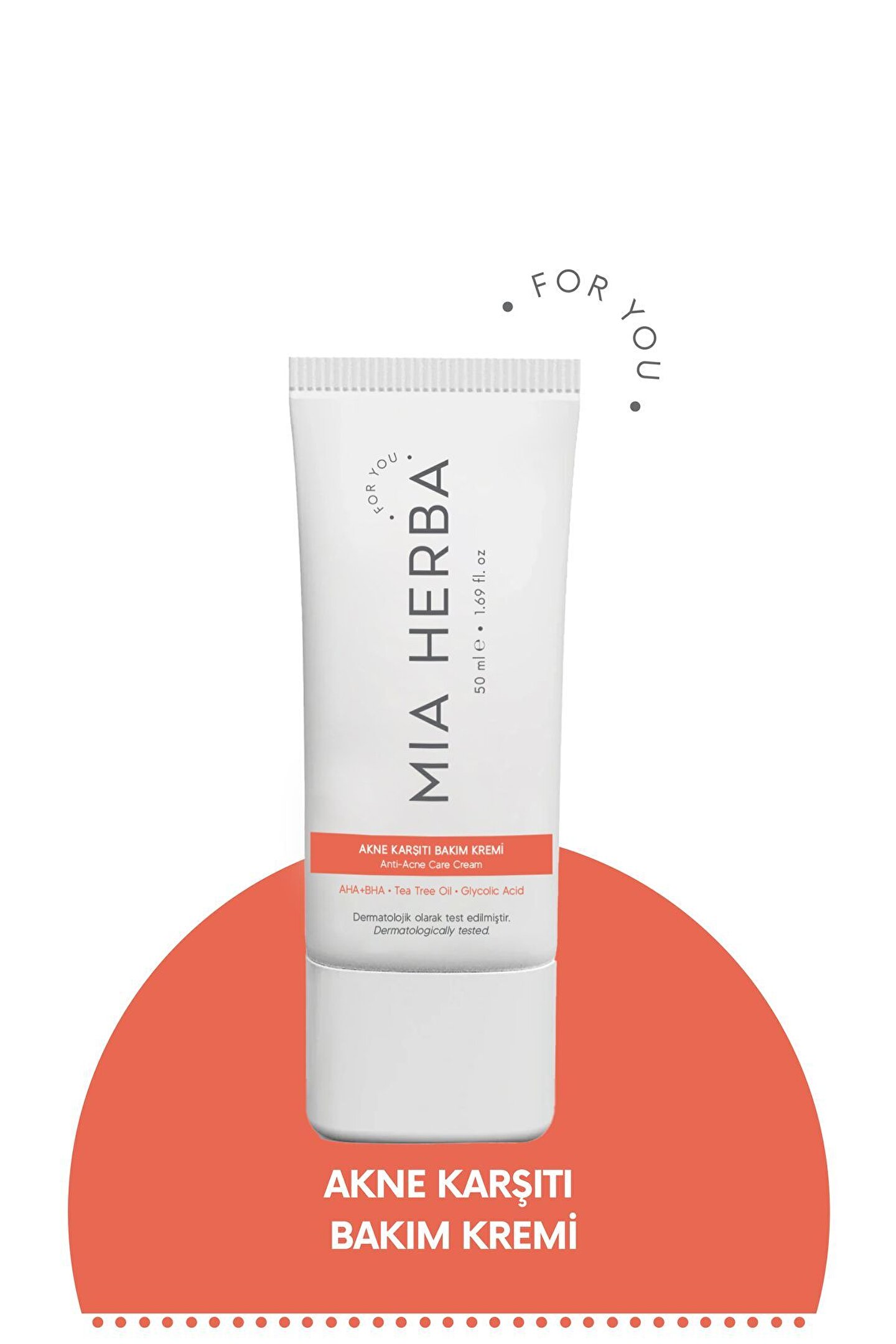Mia Herba Akne Karşıtı Bakım Kremi Ürün Açıklaması: Mia Herba Akne Karşıtı Bakım Kremi, güçlü doğal içerikleri ile akne sorunlarına karşı etkili bir çözüm sunar.; Çay ağacı yağı, kekik yağı ve ardıç meyvesi yağı gibi doğal yağları içeren özel formülasyonu ile cildinizi besler ve akne oluşumunu önlemeye yardımcı olur.; Salisilik asit ve glikolik asit içerdiği AHA ve BHA bileşenleri sayesinde peeling etkisi gösterir, ölü deriyi nazikçe uzaklaştırır ve cildin sebum dengesini düzenler.; Çay ağacı yağı ve salisilik asit ile cildin mat ve temiz görünümüne kavuşmasına destek olur.; Doğal ve etkili bileşenlerle cildinizi temizler, arındırır ve sağlıklı bir görünüm kazandırır.; Temiz ve arınmış bir cilde sahip olurken görünümünüzü güzelleştirir.; Faydaları: Akne ve akne lekeleri ile mücadele eder.; ; Çay ağacı yağı, kekik yağı ve ardıç meyvesi yağı ile akne oluşumunu engeller.; ; Salisilik ve glikolik asit ile ölü deriyi nazikçe uzaklaştırır ve cildin sebum dengesini sağlar.; ; AHA ve BHA ile peeling etkisi gösterir, ve cilt tonunu eşitler.; ; Çay ağacı yağı bakterileri etkisiz hale getirir.; ; Kuşburnu yağı ile cildin parlaklığını artırır.; ; Aloe Vera ile cildin nem dengesini sağlar ve tahrişi azaltır.; ; Lipozomal taşıyıcı fosfolipitler etken maddelerin emilimini artırır.; ; İçindekiler: AQUA, HELIANTHUS ANNUUS SEED OIL, CAPRYLIC/CAPRIC TRIGLYCERIDE, CETEARYL ALCOHOL, GLYCERYL STEARATE, CETEARETH-25, MELALEUCA ALTERNIFOLIA LEAF OIL, MYRTUS COMMUNIS LEAF WATER, GLYCOLIC ACID, ALLANTOIN, SCLEROTIUM GUM, LYSOLECITHIN, THYMUS VULGARIS LEAF OIL, ROSA CANINA FRUIT OIL, SILICA, XANTHAN GUM, ALOE BARBADENSIS LEAF EXTRACT, SALICYLIC ACID, GLYCERIN, SODIUM HYDROXIDE, CAMELLIA SINENSIS LEAF EXTRACT, SYMPHYTUM OFFICINALE LEAF EXTRACT, COMMUNIS FRUIT EXTRACT, PULLULAN, ETHYLHEXYLGLYCERIN, PHENOXYETHANOL, SODIUM BENZOATE, PARFUM, LINALOOL, CITRONELLOL, HEXYL CINNAMAL, ALPHA-ISOMETHYL IONONE, CITRAL.; Uyarılar: Orijinal ambalajında ve serin yerde muhafaza ediniz.; ; Çocukların ulaşamayacağı yerde saklayınız.; ; Güneş ışığına maruz bırakmayınız.; ; İçindeki bileşenlere karşı alerjiniz varsa kullanmayınız.; ; Göze temasından kaçınınız.; Göze temas etmesi durumunda bol su ile iyice durulayınız.; ; Sadece harici kullanım içindir.; ; 3 yaşın altındaki çocuklarda kullanılmaz.; ; Kullanım Önerisi: Cildinizi iyice temizledikten sonra kremi cildinize masaj yaparak uygulayınız.; ; Sabah ve akşam olmak üzere günde 2 defa uygulama yapabilirsiniz.; ; Düzenli kullanım önerilir.; ; Diğer Bilgiler: Alkol içermez ; Gluten içermez ; Vegandır ; Hayvanlar üzerinde test edilmemiştir ;