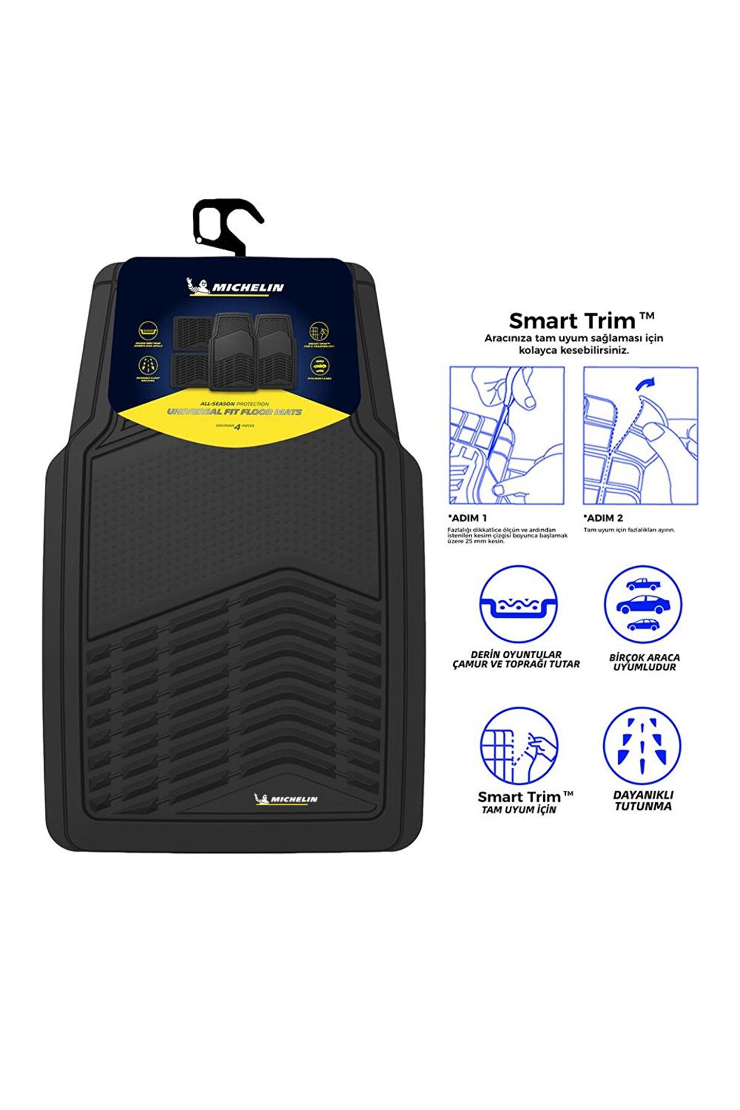 • Michelin MC33856 Tüm Araçlara Uyumlu 4 Parça Üniversal 3D Havuzlu Oto Paspas • Universal Tasarımı ve kesilebilir tasarımı ile tüm marka ve model araçlara mükemmel uyum sağlar.; • Uluslararası standartlara uygun kaliteli malzemeden üretilmiştir.; • Kaliteli malzemeden üretilmiştir, Alerjik ve kanserojen madde içermez.; • Universal olarak üretilmiş olup, makas yardımıyla kesim yerlerinden kesip kendi aracınıza uygun hale getirebilirsiniz, bütün araçlara uyumlu hale getirilir.; • Kaymayı engelleyen özel dişli taban tasarımı sayesinde sürüş pedallarına doğru toplanma ve kayma yapmaz, sürüş güvenliği sağlar, kaza riskini önler.; • Paspas üzerinde ayağınızı rahat hareket ettirmenizi sağlayan özel ergonomik oluklar sayesinde maksimum sürüş güvenliği sağlar.; • Şoför ve yolcu tarafı özel olarak tasarlanmış, güçlendirilmiş topuk destek alanı ile aşınmaya karşı uzun kullanım ömrü sunar.; • Gelişmiş Performanslı Plastikten üretilmiş olup, yüksek ısı ya da yüksek soğuğa maruz kalsa da orijinal yapısını korur, kırılma, çatlama ya da sertleşme olmaz.; • Gelişmiş Performanslı Plastikten üretilmiş olup, aşınma ve delinme olmadan uzun süre kullanılabilir, deformasyona uğramaz, • Uluslararası standartlara uygun olarak yüksek teknoloji ile hijyenik malzemeden üretilmiştir, • Özel tasarım ergonomik oluklu yapısıyla toz, kir ve çamurun aracınızın zeminine ulaşmasını engeller, Yağmurda, Karda, Çamurda, 4 mevsim güvenle kullanım sağlar.; • Geri dönüştürülebilen hammaddeden üretilmiştir, • Diğer paspasların aksine ince olmadığı için delinme ve ayak altında toplanmaya karşı dayanıklıdır, • Özel tasarım Yüksek kenarlıklar ve kanallar sayesinde kir ve pisliği içinde tutarak aracınızın halısını her türlü su, kar, çamur, toz ve topraktan korur.; Su geçirmez ve leke tutmaz.; • Özel tasarım kenarlıklar sayesinde, arabanızın döşemesini lekelere, dökülmelere ve günlük yıpranmaya karşı koruyun.; • Kolay temizlenebilen modern tasarım, • Aracınızın taban döşemesinde oluşacak kalıcı lekelere karşı etkin ve uzun ömürlü koruma sağlar, • 4 parçadan oluşmaktadır, • 100 yıllık Michelin kalitesi ile yenilikçi teknoloji • NOT: ÜRÜN ARACA ÖZEL DEĞİLDİR KESİM YERLERİNDEN KESEREK ARACINIZA UYGUN HALE GETİREBİLİRSİNİZ.