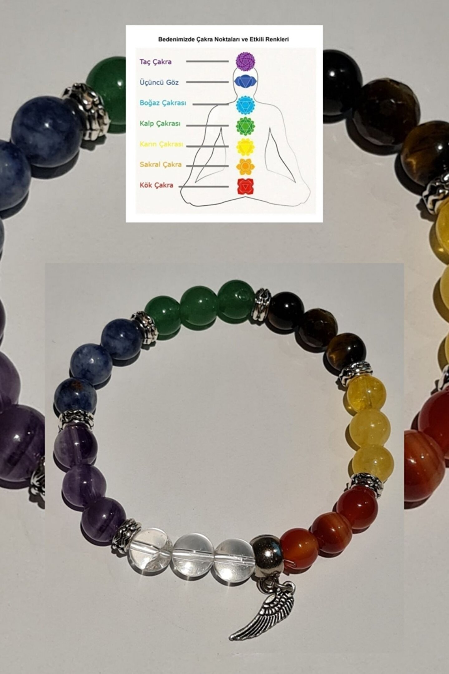 7 Çakra Taşı Bilekliği - 3 Adet Kristal Kuvars -3 adet Ametist -3 Adet Sodalit -3 Adet Aventurin -3 Adet Kaplan Gözü -3 Adet Sitrin -3 Adet Akik Doğal taşları bulunmaktadır. ; -6 ara halka ve ucunda Melek Kanadı Süsü vardır. ; **Şeffaf Misine Kullanılmıştır. ; Takması ve çıkartması çok kolaydır. ; -İsime göre kodlama yapılacaktır. ; Lütfen soru sor kısmından İsim soy isim doğum tarihinizi yazar mısınız?;